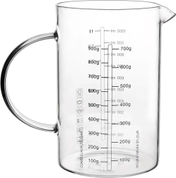 De schalen zijn goed leesbaar en maken snel en betrouwbaar afmeten mogelijk. Je vindt er maatverdeling voor vloeistoffen in ml (100–1000 ml) en in liters (1/8 l – 1 l), evenals omrekentabellen voor meel (100–700 g) en suiker (100–900 g). De maximaal aangegeven capaciteit is 1 l, het werkelijke volume van de kan is tot 1,2 l.