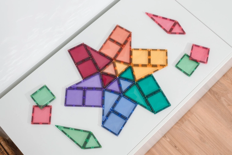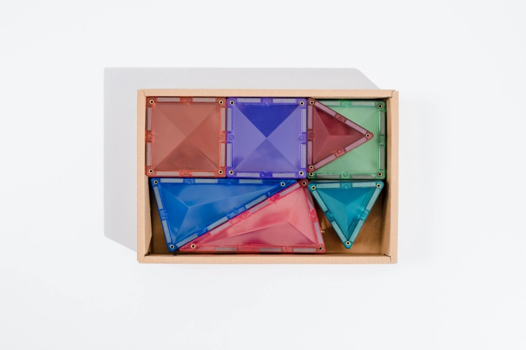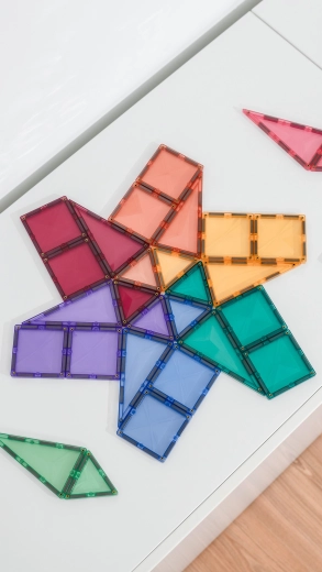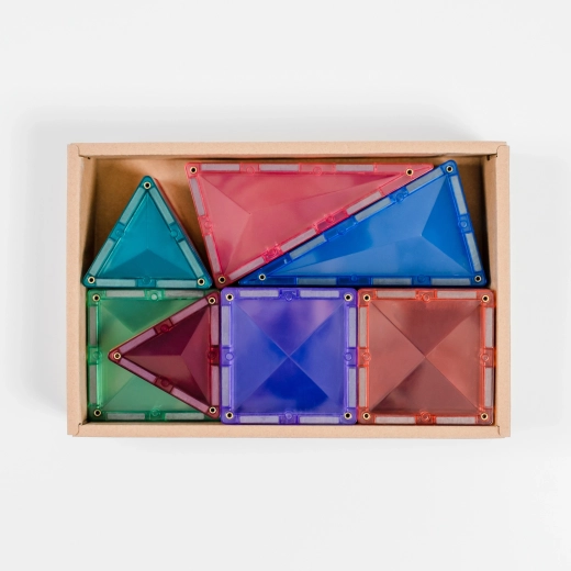 De set bevat 16 kleine vierkanten, 8 gelijkzijdige driehoeken en 8 gelijkbenige driehoeken plus een geïllustreerd inspiratieboekje. Dankzij de compatibiliteit met andere CONNETIX-sets breid je bouwwerken eindeloos uit. Transparante kleuren laten prachtig licht door en stimuleren zintuiglijk spel.