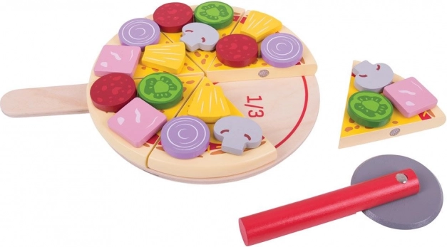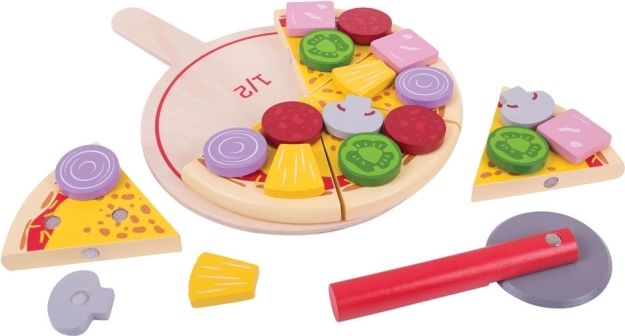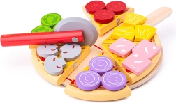 De houten snijpizza is het ideale speelgoed voor creatief rollenspel. Kinderen kunnen “bakken”, snijden en serveren, de pizza versieren met champignons, ui, paprika of salami en zo hand-oogcoördinatie trainen. De plank met breukmarkeringen helpt speels begrippen als 1/2, 1/3 of 1/6 uit te leggen.