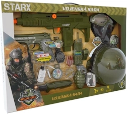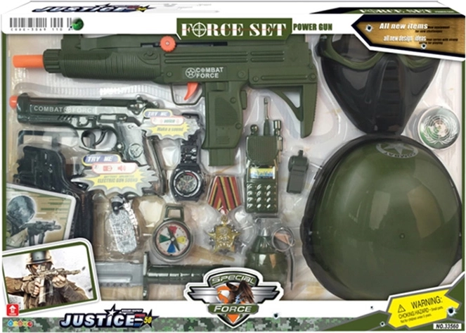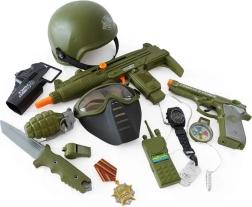 Set voor de kleine soldaat met helm, pistool en andere accessoires.