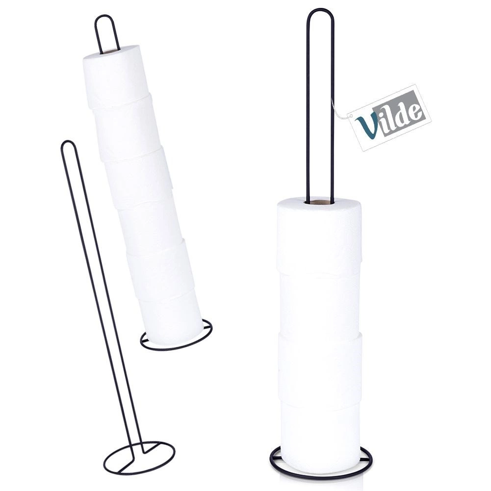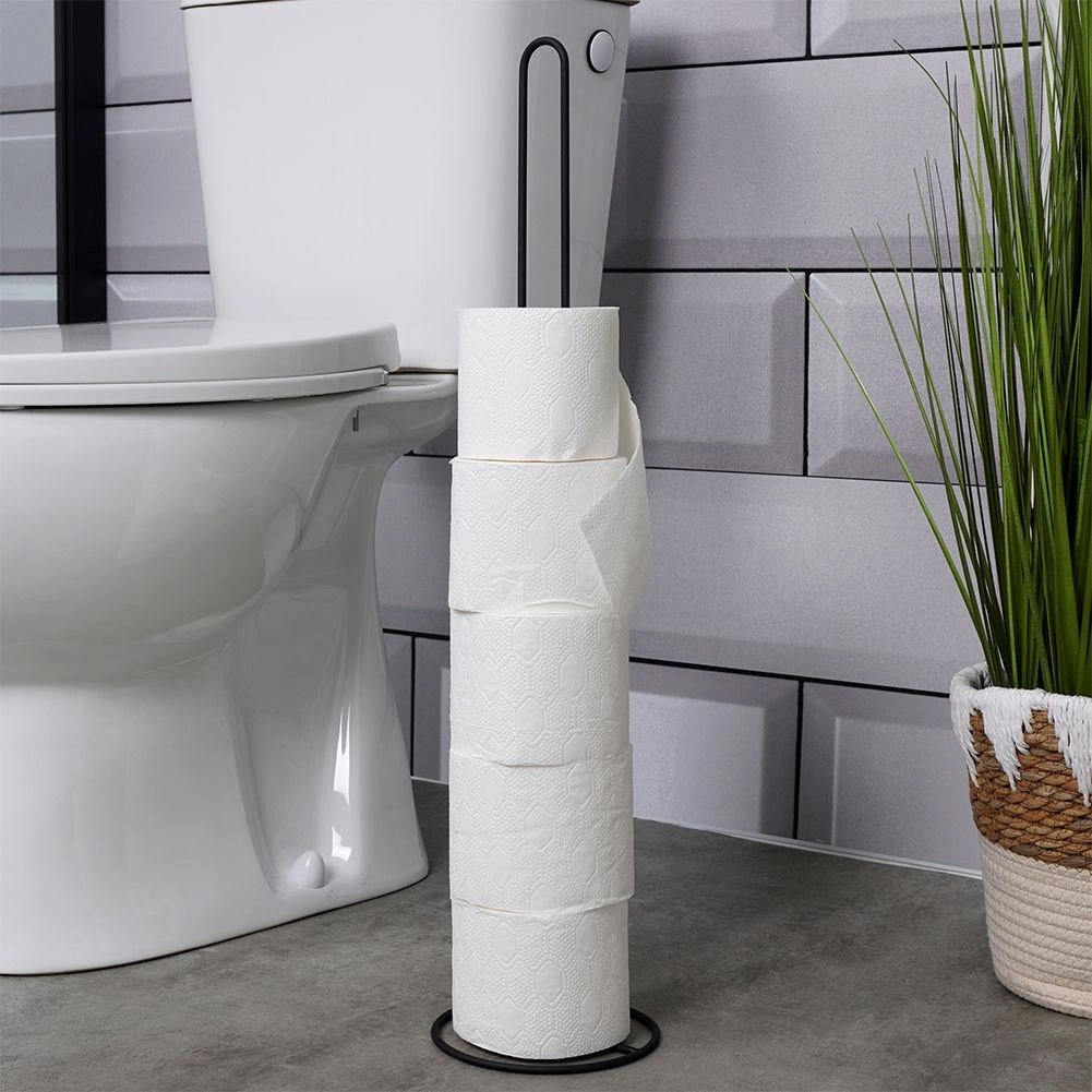 Vrijstaande toiletrolhouder in een minimalistisch design combineert functionaliteit en stijl. De slanke constructie met handgreep maakt makkelijk verplaatsen en snel bijvullen van rollen mogelijk. De matte zwarte afwerking past perfect bij moderne sanitaire voorzieningen en accessoires.