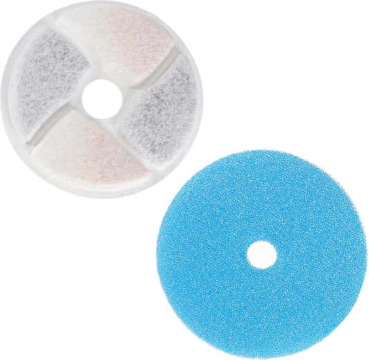 - Fontein (reservoir met markering, deksel, filterhouder en uitloop met twee opzetstukken), koolstoffilter met filterwatten, USB‑pomp, handleiding