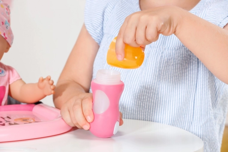 Geniet van de flexibiliteit met twee opzetstukken: één voor drinken en een andere met een lepel voor voeren, waardoor dit speelgoed een veelzijdige aanvulling is op elk poppenspel.