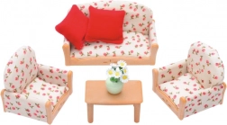 De verpakking bevat een bank, twee fauteuils, een salontafel met bijpassend design en een decoratieve vaas met vers geplukte madeliefjes. Het duo felrode kussentjes geeft het interieur een opvallend accent en zorgt voor comfort tijdens het spelen.