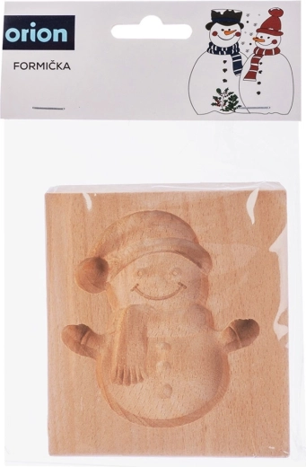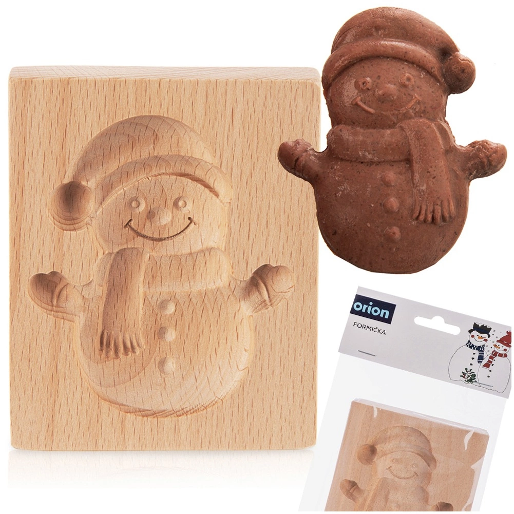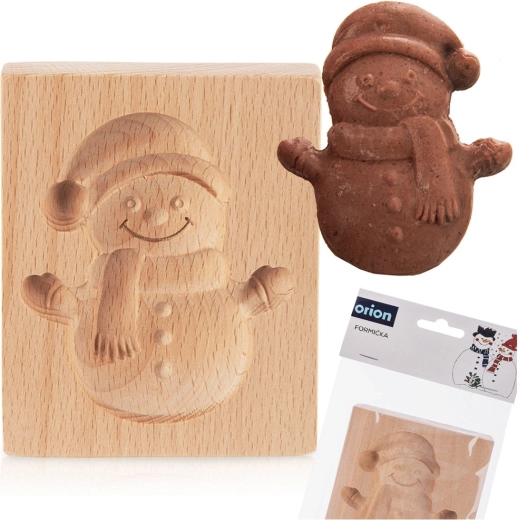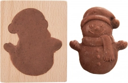 Deze houten mal in de vorm van een glimlachende sneeuwpop is ideaal voor feestelijk bakken en knutselen met kinderen. Het reliëfgesneden motief creëert een mooi, plastisch patroon dat op koekjes, peperkoek of chocolade prachtig uitkomt. De buitenafmetingen van de mal zijn 11 × 9,5 × 2 cm, het resulterende sneeuwpopmotief is ongeveer 8,7 × 7,5 cm.