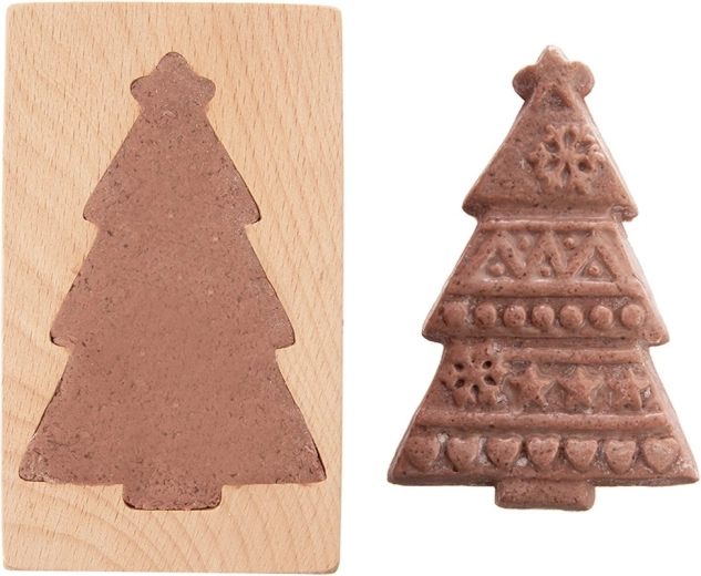 Deze houten mal in de vorm van een boom is een uitstekende keuze voor het bakken van koekjes, peperkoek en het maken van fondantdecoraties. De fijne gravure zorgt voor schone afdrukken van sterretjes, hartjes en ornamenten die je creaties een feestelijke uitstraling geven. Voor gemakkelijk lossen van het deeg raden we aan de mal licht te bebloemen of met voedselveilig folie te bekleden.