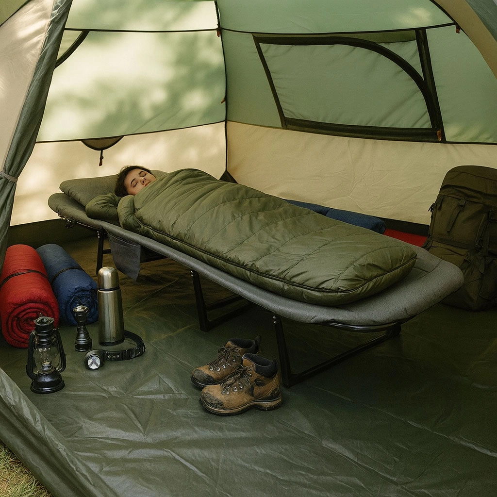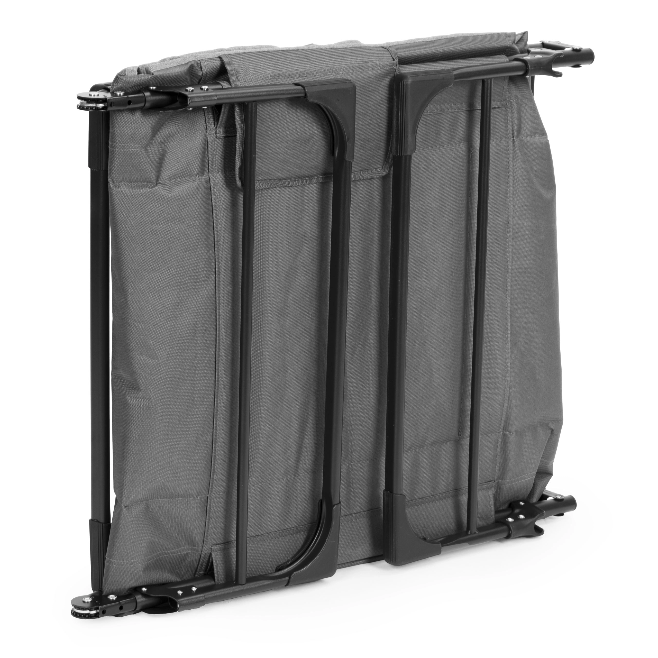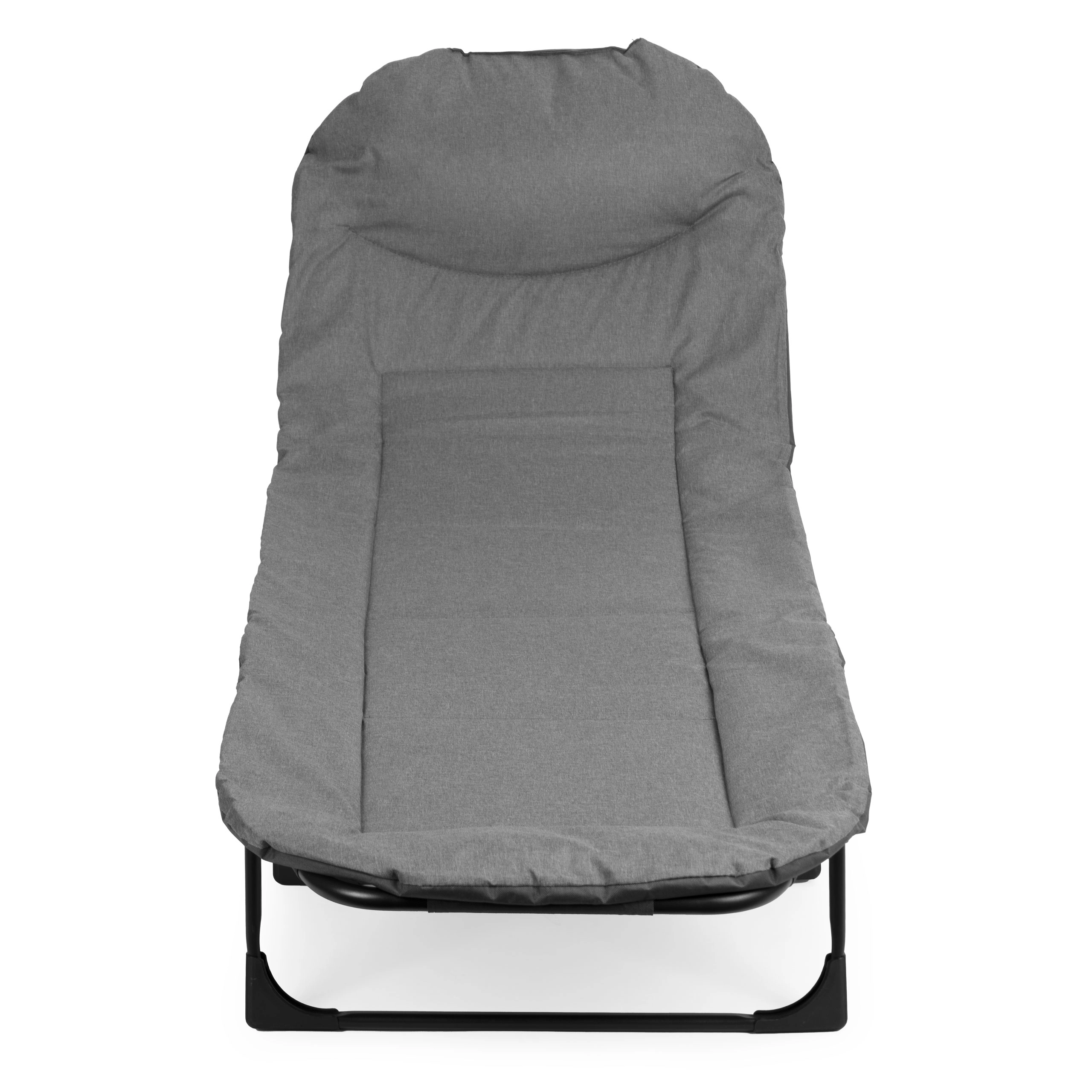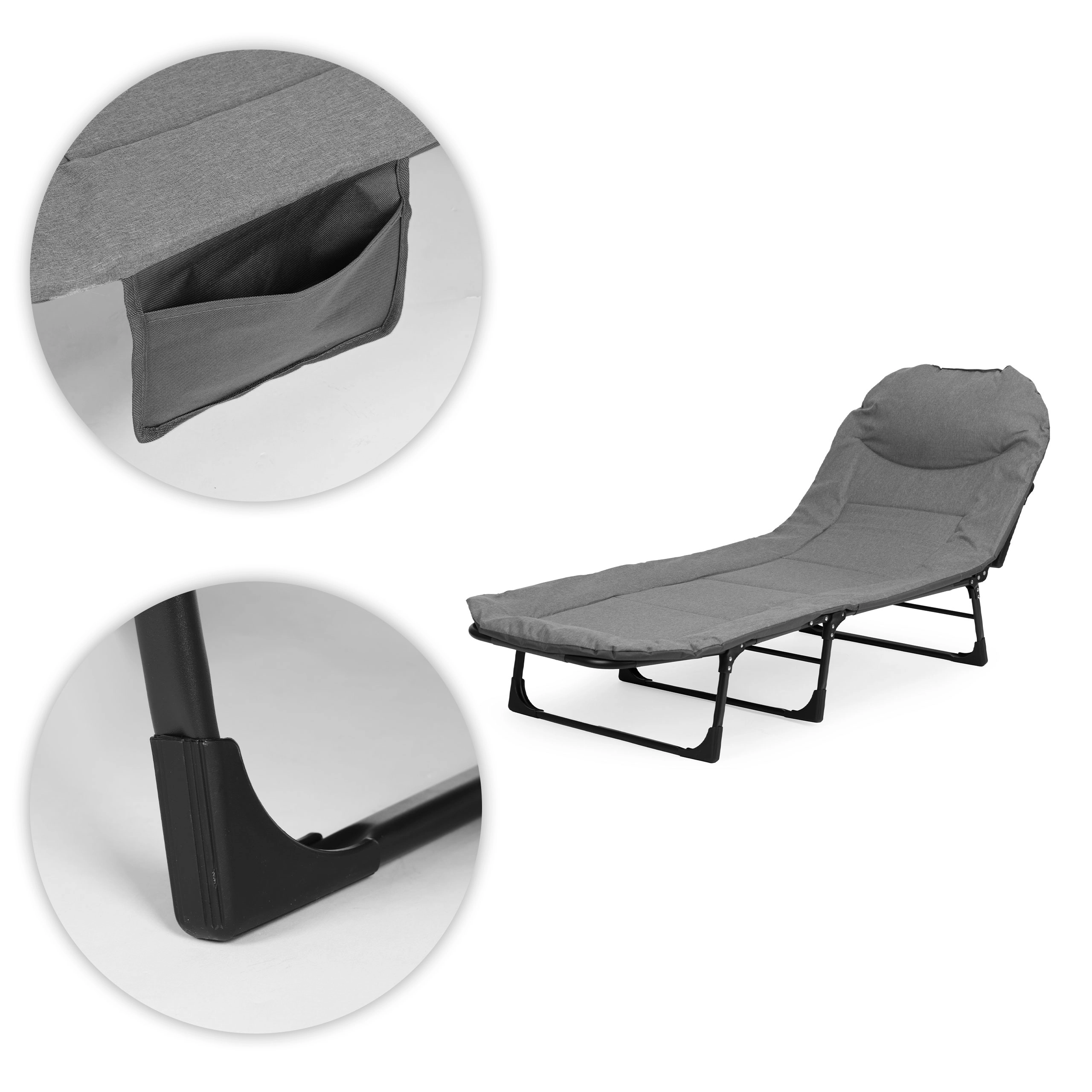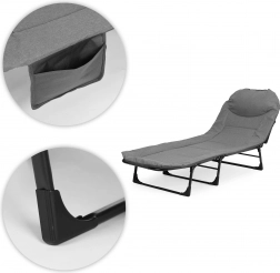 Het ligbed is snel opvouwbaar tot een compact formaat, zodat je het zonder moeite in de auto of kast opbergt. Het zijvak houdt telefoon, bril of boek bij de hand en de zachte geïntegreerde hoofdsteun verhoogt het comfort bij langer liggen.