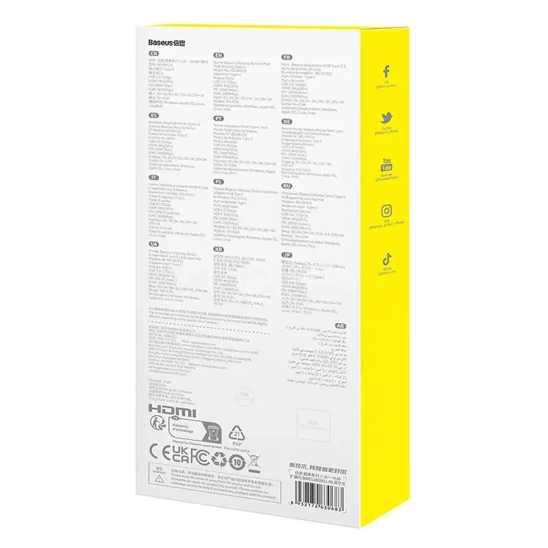 De compacte BASEUS UltraJoy 6-in-1 hub breidt je laptop of tablet uit met HDMI 4K@30 Hz, 3× USB 3.0 (tot 5 Gb/s), RJ45 1.000 Mb/s en USB‑C PD 100 W voor snel opladen. De elegante aluminium behuizing, de duurzame gevlochten kabel en de brede compatibiliteit zorgen voor een stabiele verbinding en maximale productiviteit thuis, op kantoor en onderweg.