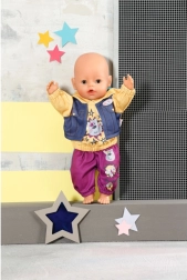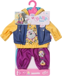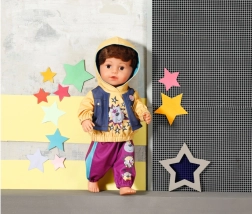 Geef je pop een moderne streetlook. De set bevat een gele hoodie met capuchon 2-in-1 met een opgestikte bodywarmer in denimlook en comfortabele joggingbroek in een opvallende braambessenkleur. Grappige dierenprints en sterren geven de kleding een speelse touch en inspireren tot creatieve verhalen en lang speelplezier.