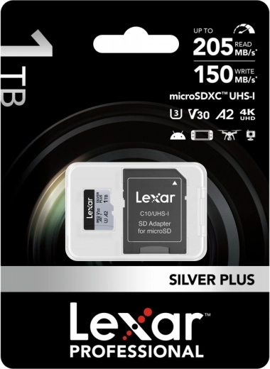 Breid je opslag uit en versnel je workflow met de Lexar microSDXC 1 TB Silver Plus met snelheden tot 205 MB/s lezen en 150 MB/s schrijven. Ondersteuning voor A2, U3 en V30 zorgt voor vloeiende 4K‑video en snel opstartende apps. Robuuste constructie met IPX7-bescherming en brede compatibiliteit voor DJI, GoPro, Nintendo, Steam Deck en andere apparaten.