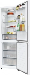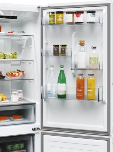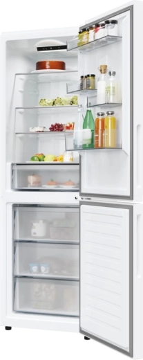 Deze vrijstaande koel-vriescombinatie met de vriezer onder combineert een strak, minimalistisch design met een doordachte interne indeling. Transparante boxen en verstelbare leggers maken het eenvoudig om drankjes, fruit, groenten en kant-en-klaarmaaltijden overzichtelijk op te bergen, terwijl het heldere LED-licht voor perfecte zichtbaarheid tot in elke hoek zorgt.