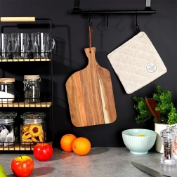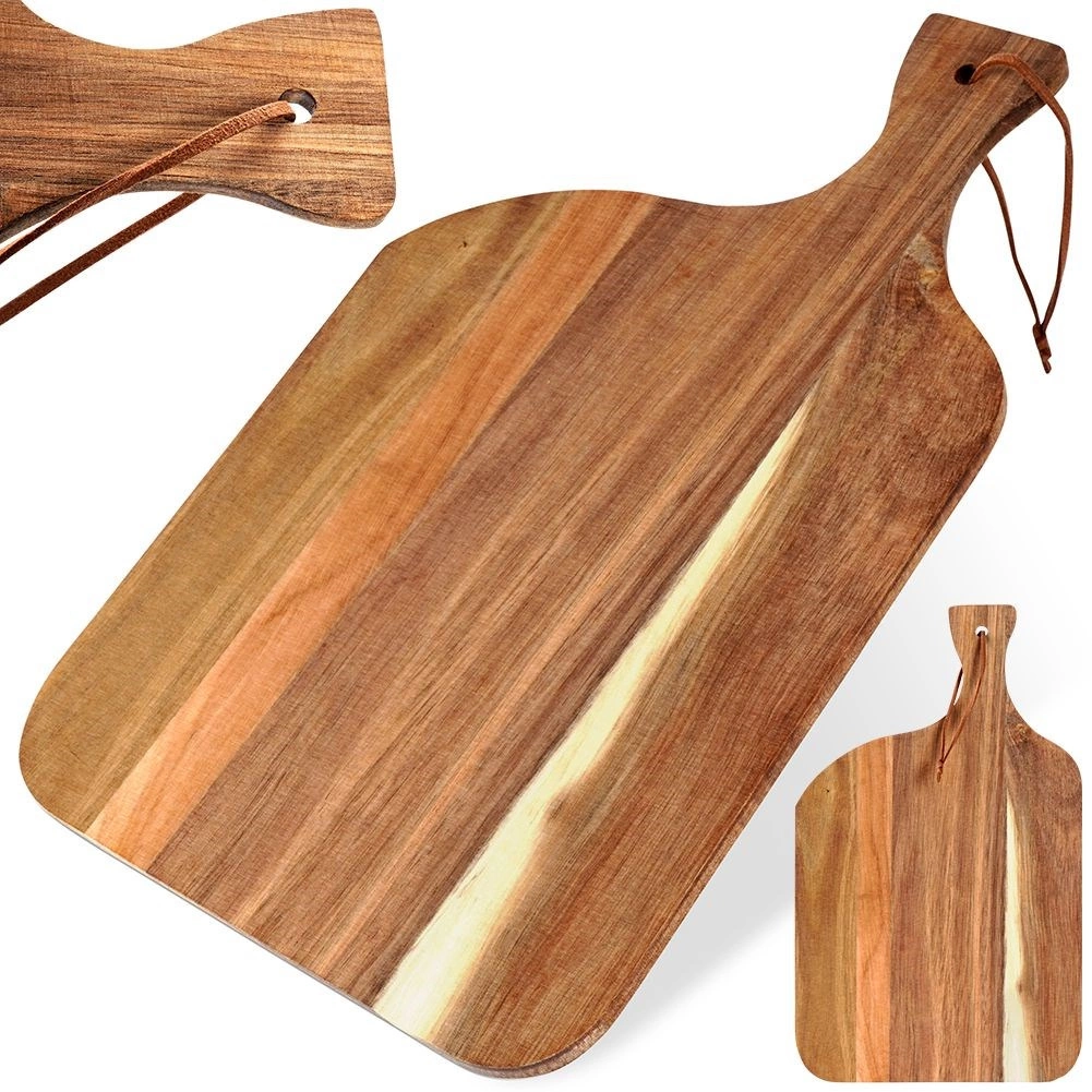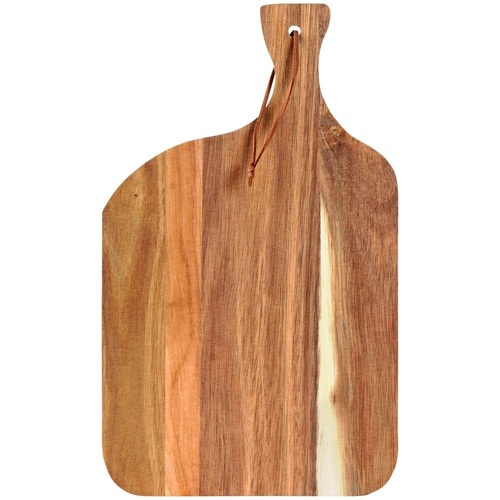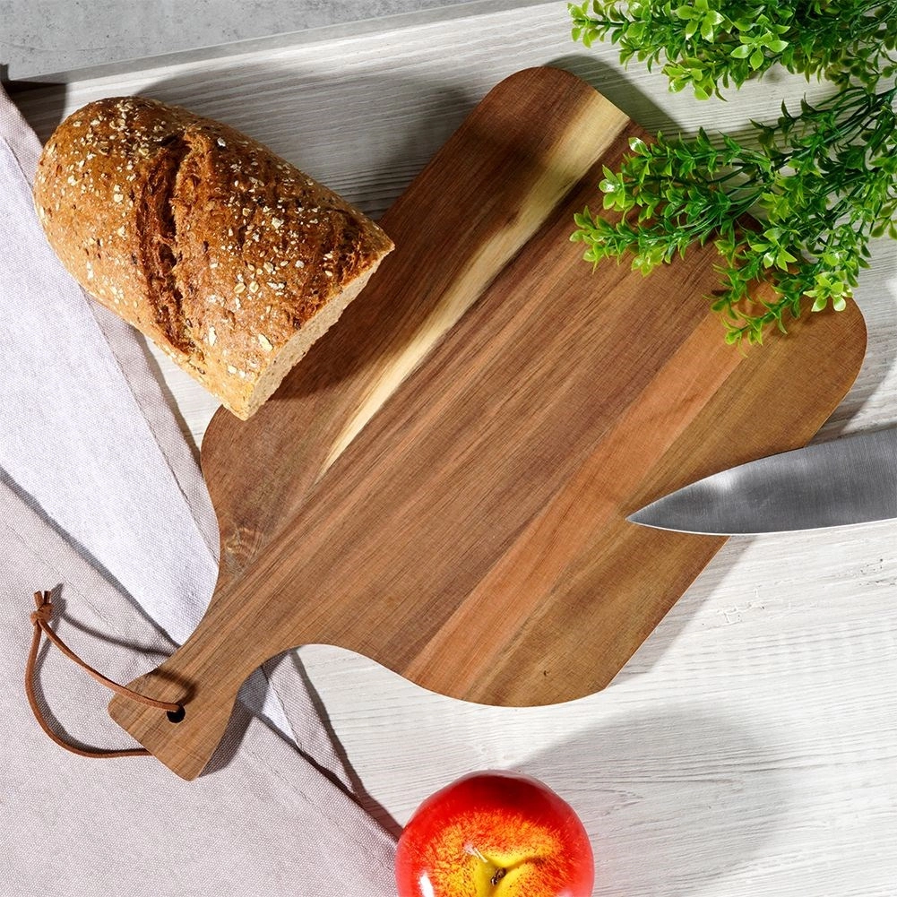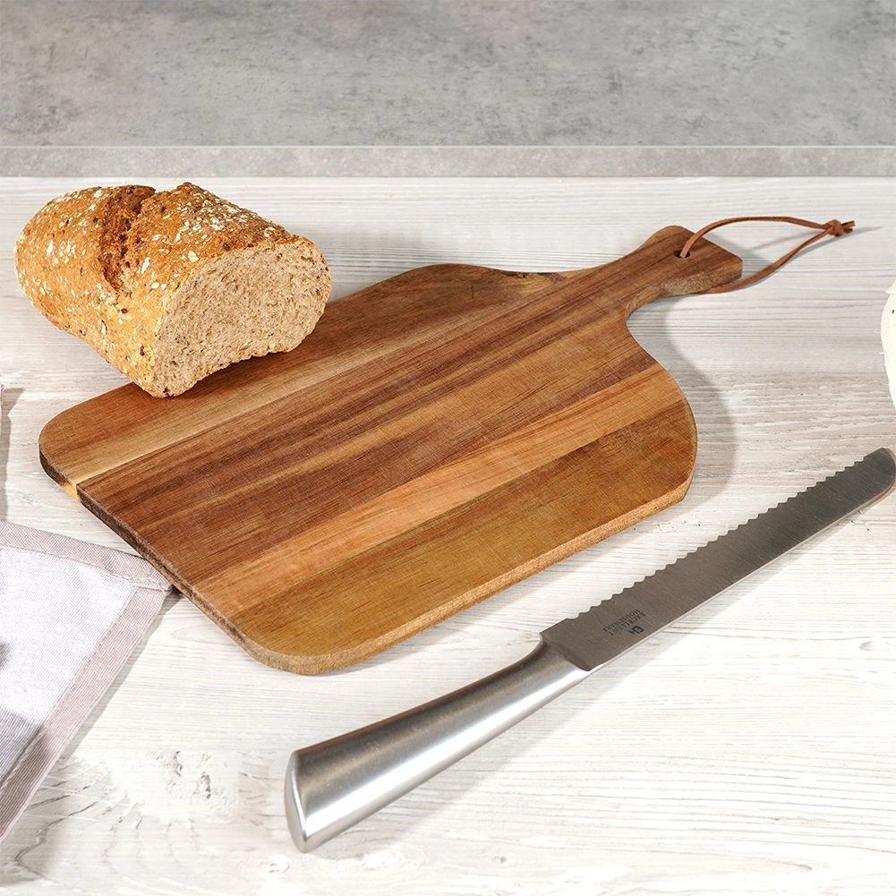 De veelzijdige plank van hoogwaardig acaciahout is een praktische hulp in elke keuken. Uitblinkend door de prachtige houttekening, het comfortabele handvat en de opening met leren lus voor eenvoudig ophangen. Perfect voor het snijden van vlees, groente en fruit en het serveren van kazen en hapjes.