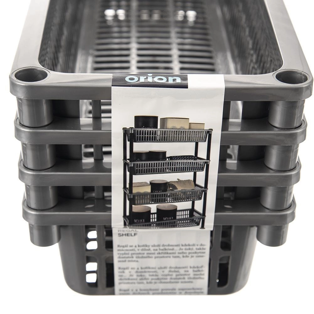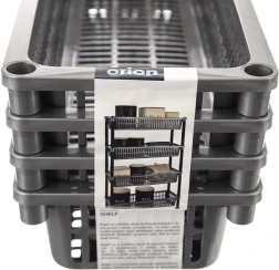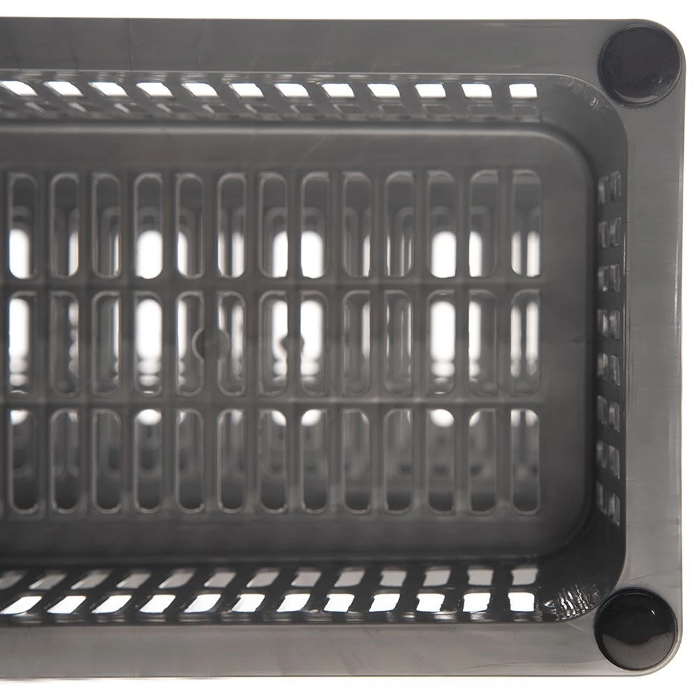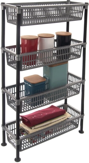 Het smalle GREY-rek met afmetingen 83 × 19,5 × 50 cm is ideaal waar weinig ruimte maar veel spullen zijn. Vier mandjes (ca. 50 × 20 × 10 cm) bieden overzichtelijke opslag voor cosmetica, schoonmaakmiddelen, etenswaren, groente of speelgoed. Dankzij de geventileerde wanden blijft alles luchten en is de inhoud goed zichtbaar.