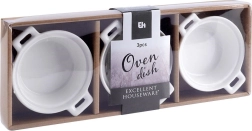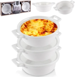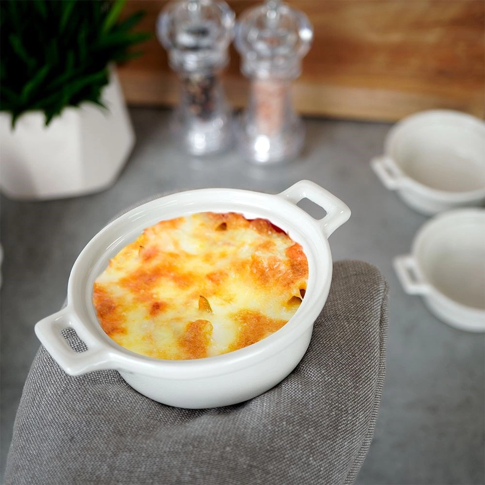 De set van 3 ronde ovenschaaltjes van hoogwaardig wit porselein vormt een elegante aanvulling op elke keuken en gedekte tafel. Dankzij het compacte formaat (ca. 13 × 10 × 4 cm) en de inhoud van 130 ml zijn ze ideaal voor het bakken en serveren van individuele porties, van desserts tot gegratineerde bijgerechten.