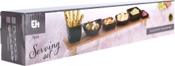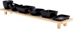 Deze designset combineert functionaliteit en esthetiek bij het dagelijks serveren. Zes keramische schaaltjes in het zwart worden aangevuld met een stevige bamboe standaard op pootjes, die alles overzichtelijk ordent en elegant boven de tafel verheft. Dankzij de nauwkeurig gevormde uitsparingen blijven de schaaltjes op hun plaats, ook tijdens het dragen.
