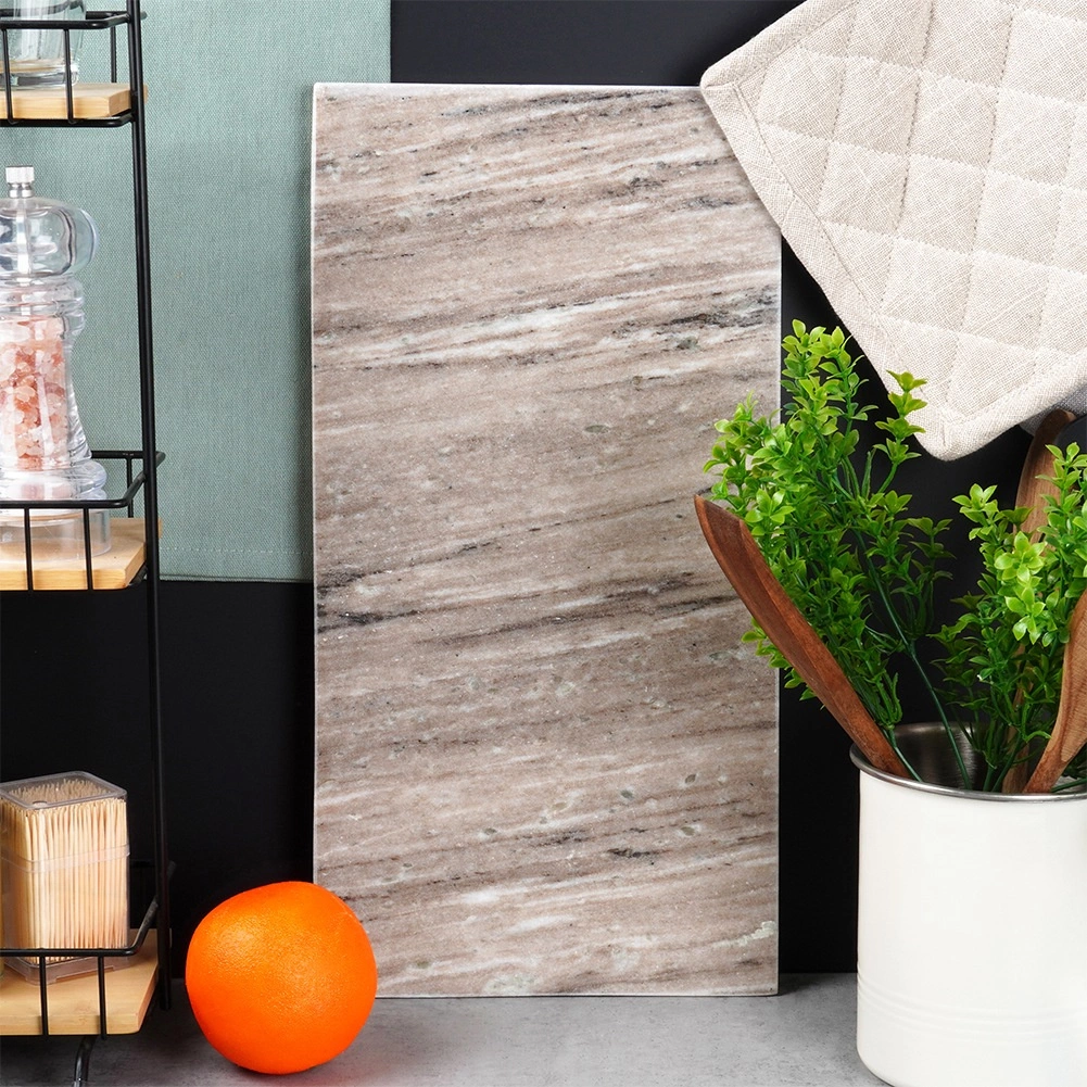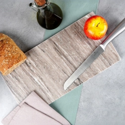 De veelzijdige plank van natuurmarmer in beige en grijze tinten brengt een combinatie van functionaliteit en design in de keuken. Te gebruiken als robuust snijoppervlak en als stijlvolle serveerplank voor kaas, vleeswaren, fruit of desserts. Marmer is van nature hittebestendig en helpt dankzij het koele oppervlak voedsel langer vers te houden.