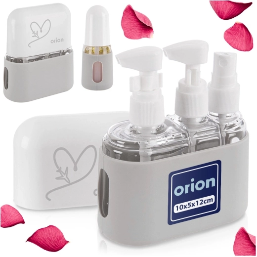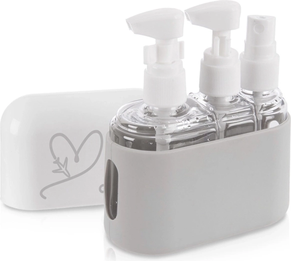 Deze compacte reisset met flesjes is ideaal voor in het vliegtuig, weekendjes weg, kamperen en voor dagelijks gebruik naar werk of school. Het transparante lichaam van de flessen zorgt voor snelle inhoudscontrole, de witte doppen sluiten stevig en beschermen tegen lekken. Het duurzame etui met siliconen bodem houdt de flesjes stabiel op hun plek en beschermt ze tegen beschadiging en vuil.