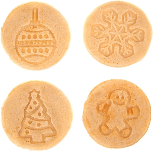Vier ronde vormpjes met reliëf van een kerstbal, boompje, peperkoekmannetje en sneeuwvlok creëren speelse porties pannenkoekjes en eieren – ideaal voor kinderen en feestelijke tafelmomenten.