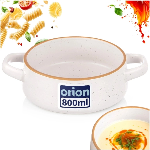 Praktische keramische soepkom met een inhoud van 800 ml en zijkantgrepen voor veilig dragen en serveren. In elegant wit met een bruine rand en subtiele spikkels, perfect voor soepen, bouillons en crèmes, maar ook voor ontbijt granen, yoghurt, fruit of salades. Vaatwasmachine- en magnetronbestendig en dankzij de stevige keramiek gemakkelijk te onderhouden.