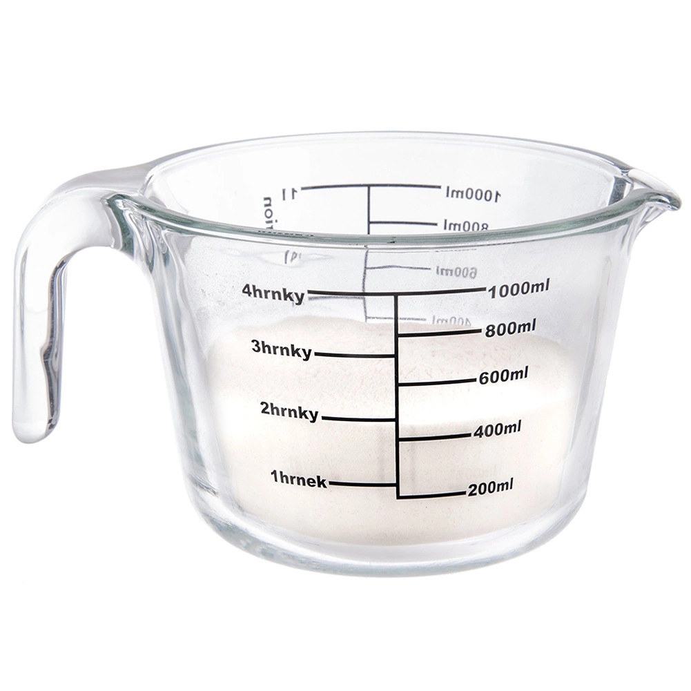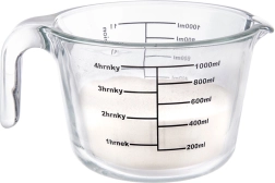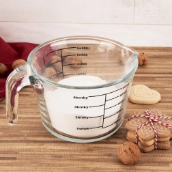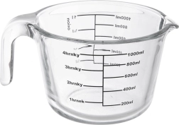 De maatbeker meet in milliliters van 200 tot 1000 ml (per 200 ml), in liters van 1/4 l tot 1 l en in cups van 1 tot 4. Het duurzame borosilicaatglas kan extreme temperatuurschommelingen aan, waardoor je de maatbeker in de koelkast, magnetron en oven kunt gebruiken.