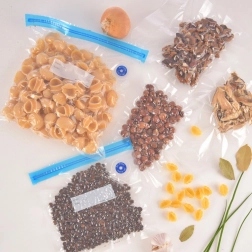 De duurzame, sterke BPA-vrije folie beschermt tegen geuroverdracht en vriesbrand. De zakken zijn afwasbaar en herbruikbaar, geschikt voor koelkast, vriezer en korte verhitting binnen het bereik van -20 °C tot +110 °C. In de verpakking zitten bovendien 2 kunststof sliders voor comfortabel sluiten.