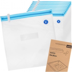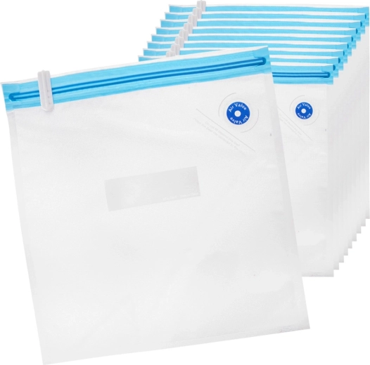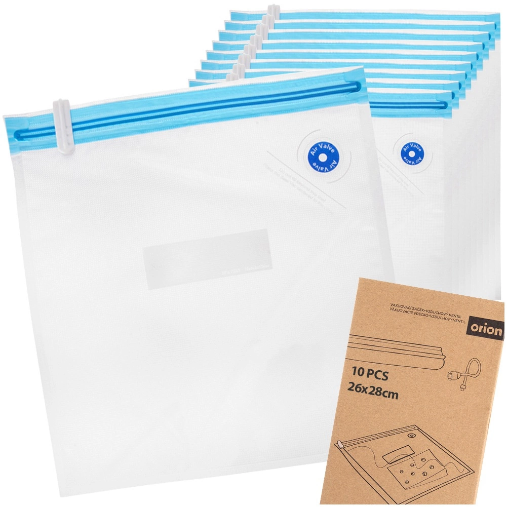 Eén zijde van de zak is glad, de andere heeft een speciale structuur voor snelle en gelijkmatige afzuiging. De set bevat 10 stuks en 2 schuifsluitingen voor eenvoudig en strak sluiten. Ideaal voor vlees, groenten, kazen, brood, noten en kant-en-klare maaltijden – thuis en onderweg.