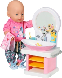 Leer kinderen goede hygiënegewoontes via spel. De wit-roze BABY born poppenwastafel biedt licht- en geluidseffecten, een echte waterstraal bij het indrukken van de kraan en schattige accessoires voor complete verzorging. Wanneer de spiegel oplicht, klinkt een melodie die dient als speelse timer voor het handen wassen.