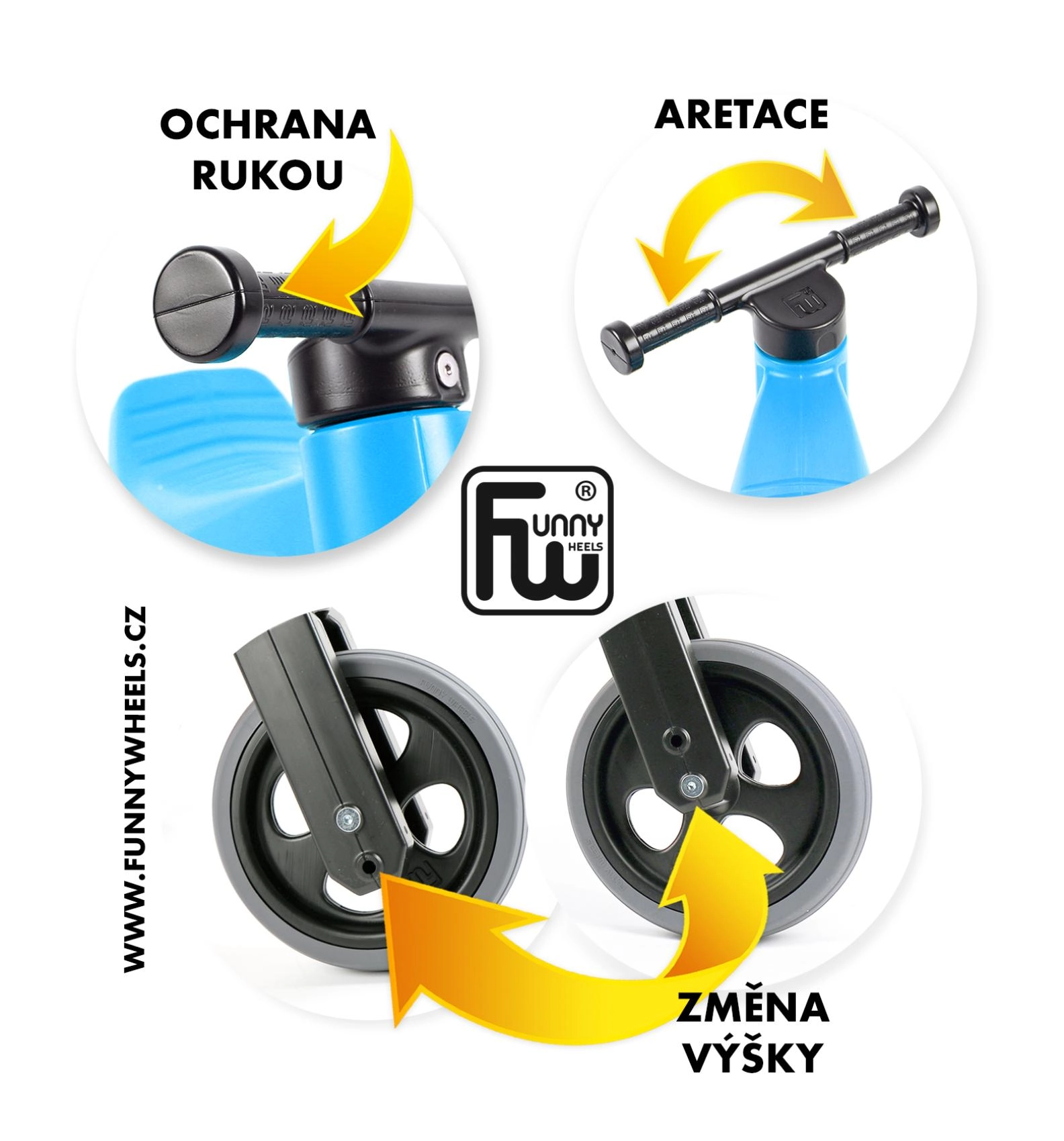 Begrensde draaicirkel van de voorvork voorkomt dat het stuur doorslaat, verbrede uiteinden beschermen de handen en het duurzame, onschadelijke kunststof heeft gladde verbindingen.