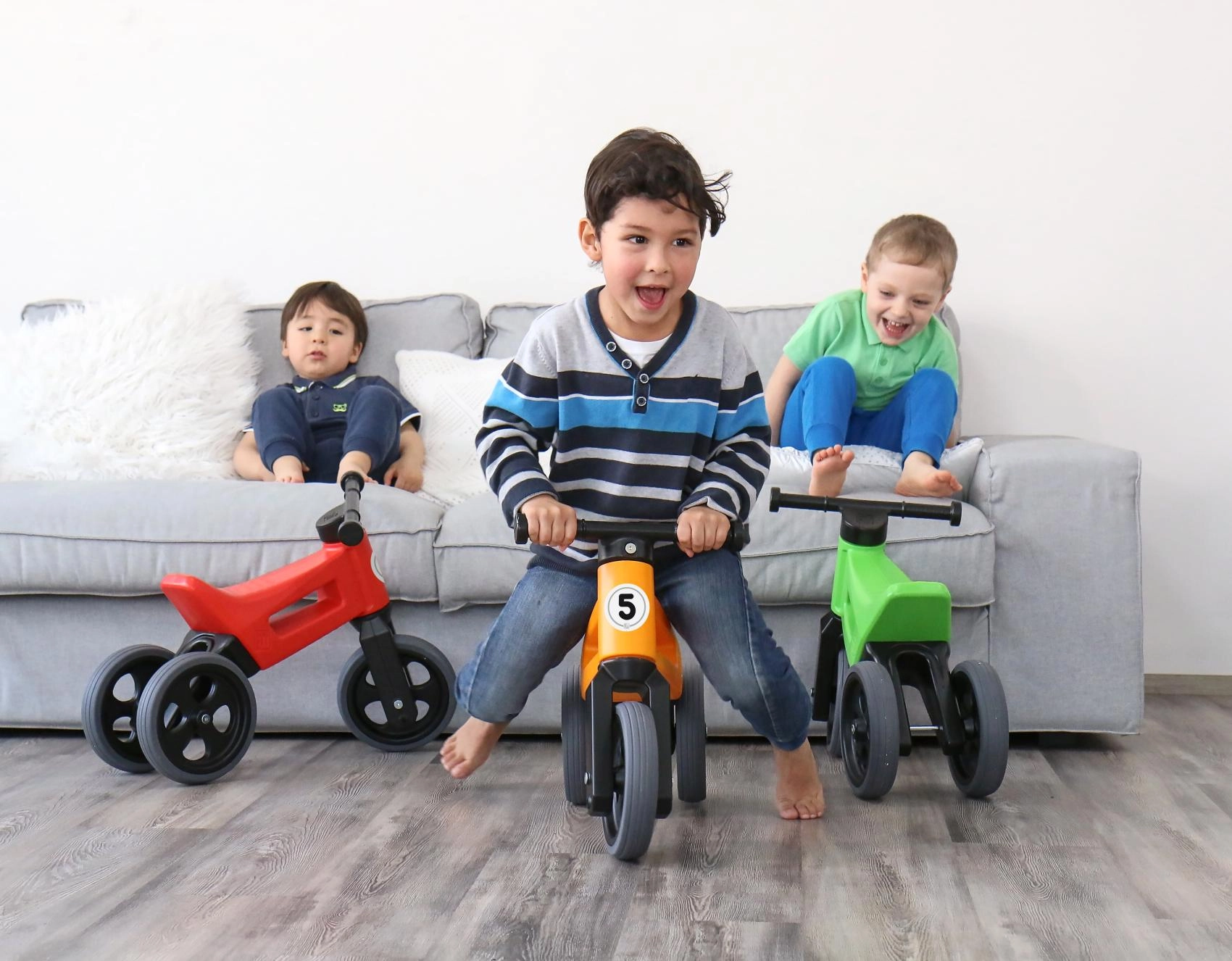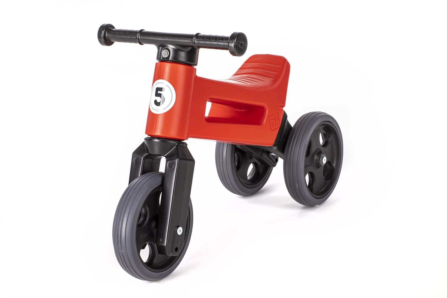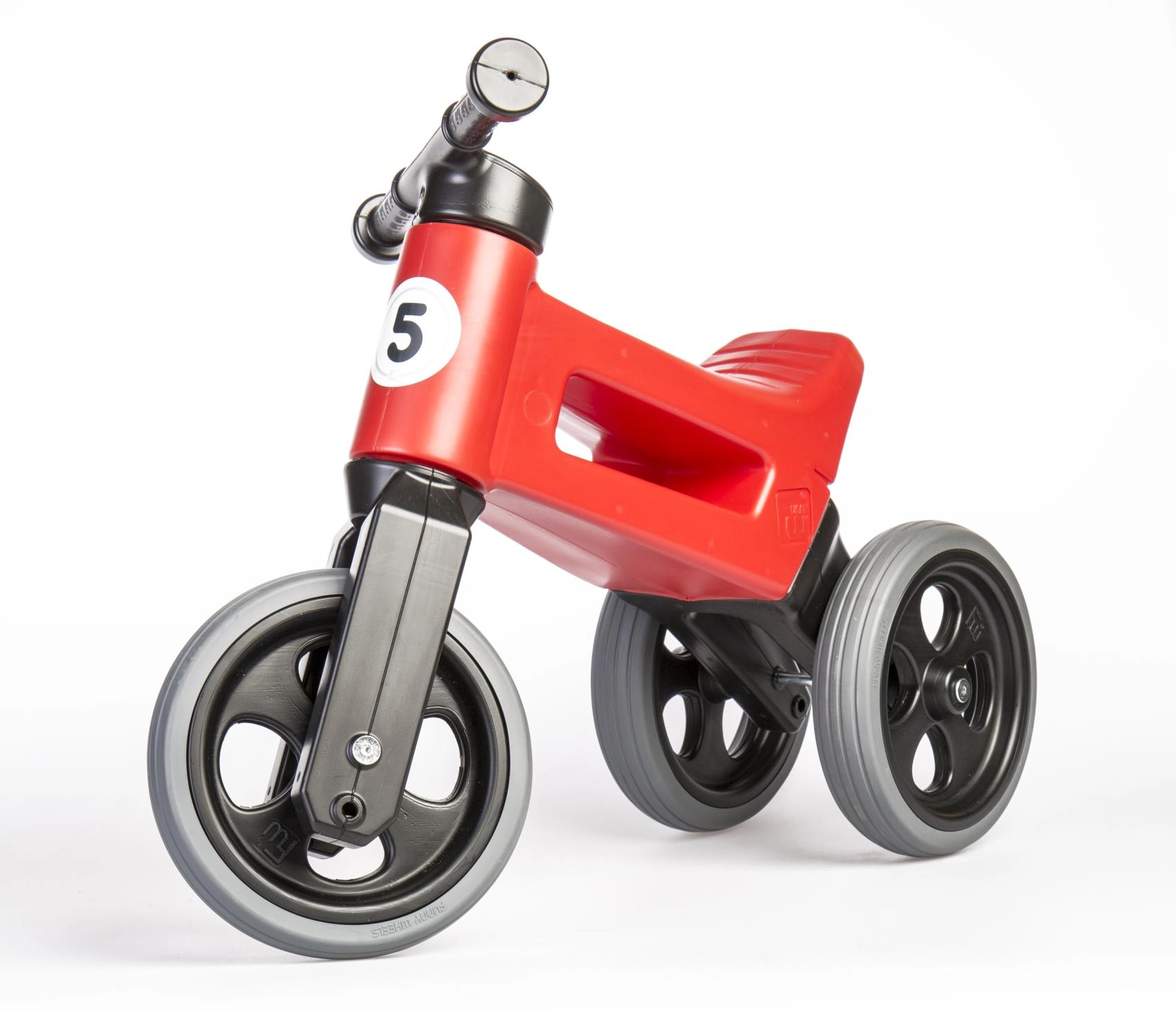 De originele Tsjechische loopfiets FUNNY WHEELS Rider Sport is ontworpen om kinderen te helpen bij hun eerste stappen richting fietsen. Dankzij het 2-in-1 systeem zet je hem in enkele minuten om van een driewieler naar een tweewieler en met de twee zadelstanden (verschil 3 cm) past hij in verschillende groeifases.