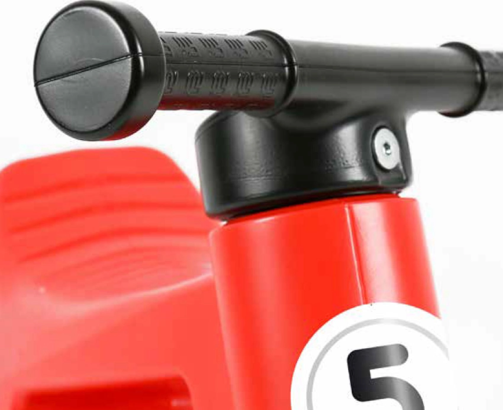 De loopfiets heeft stille banden met antislip, een gladde en veilige afwerking van duurzaam, onschadelijk kunststof en een begrensde draaihoek van de voorvork, waardoor het stuur niet kan omklappen. Kinderen trainen spelenderwijs hun balans, coördinatie en motoriek en hebben thuis én buiten veel plezier.