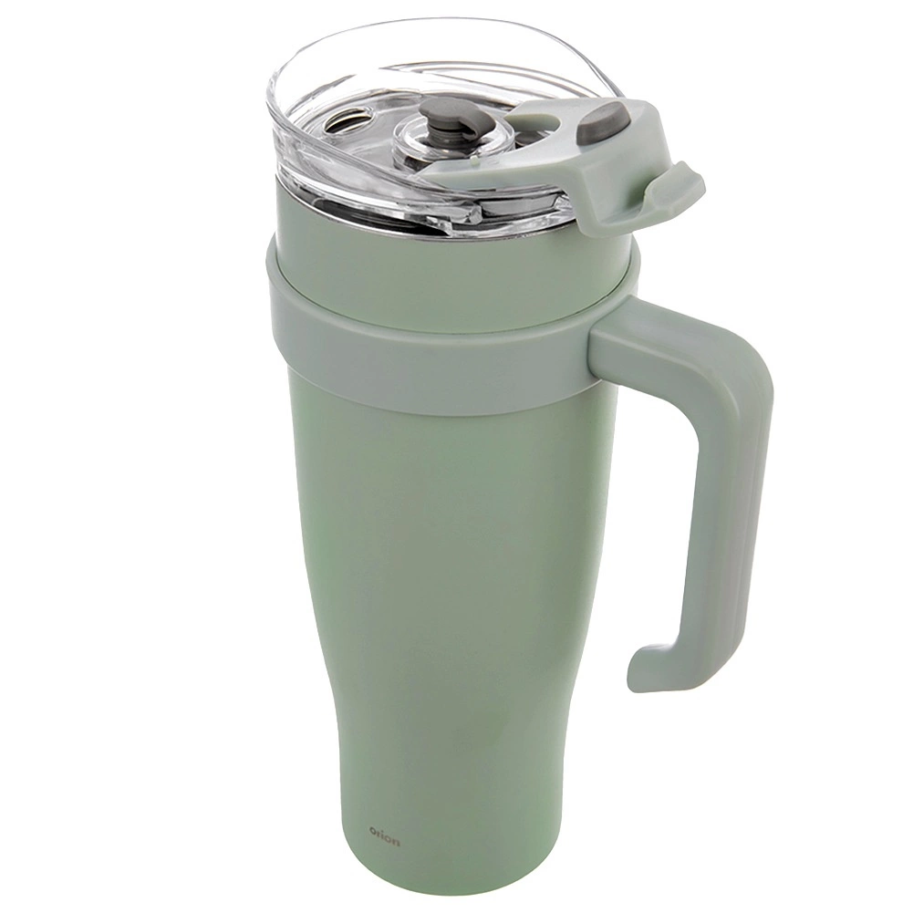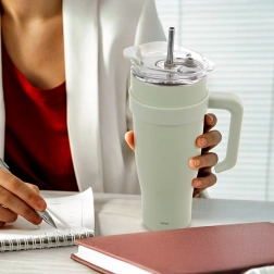Het ergonomische handvat maakt dragen gemakkelijk. De taps toelopende bodem past beter in de meeste bekerhouders in de auto en op het bureau.