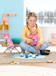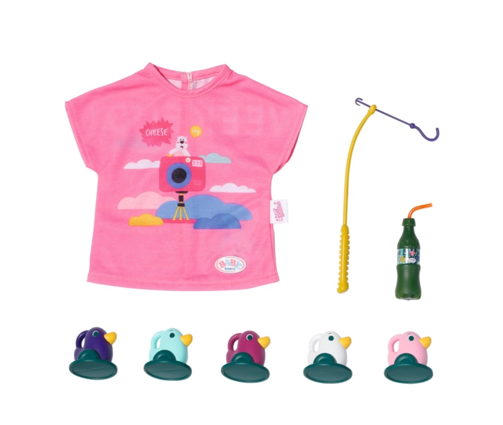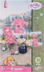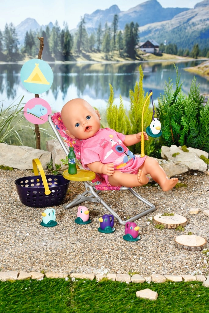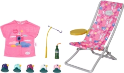 De BABY born Weekend-set voor vissen bevat een outfit, een ligstoeltje met tafeltje, een fles limonade, een mandje, 5 eendjes en een hengel.