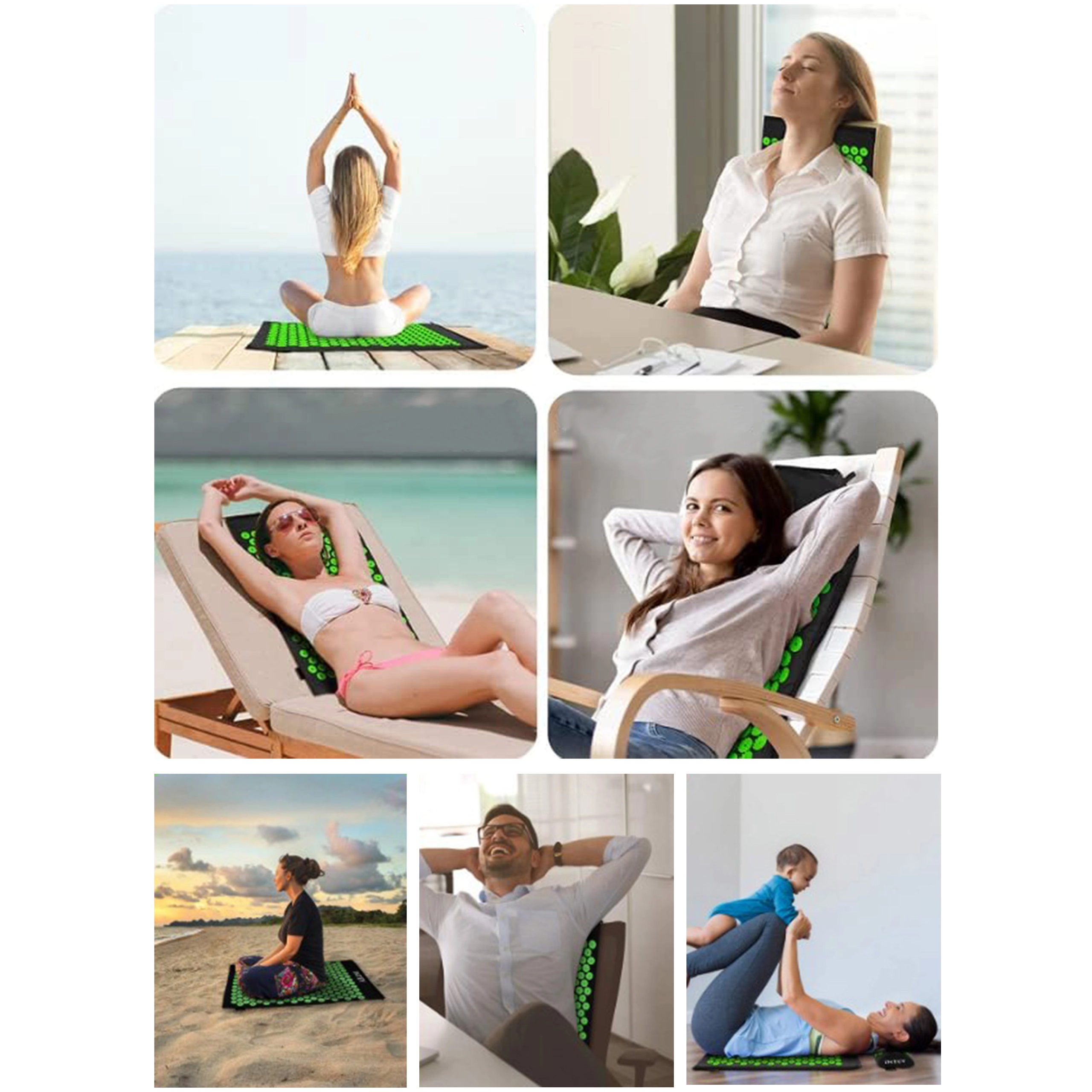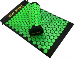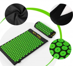 De acupressuurset (mat + kussen) bootst het effect van traditionele acupressuur na en helpt spanning in rug, nek en schouders te verminderen. Tientallen groene schijven met puntnoppen richten zich op drukpunten en ondersteunen ontspanning, spierregeneratie en natuurlijke doorbloeding. Dankzij de lichte constructie en de draagtas neem je hem gemakkelijk mee naar huis, kantoor of op reis.
