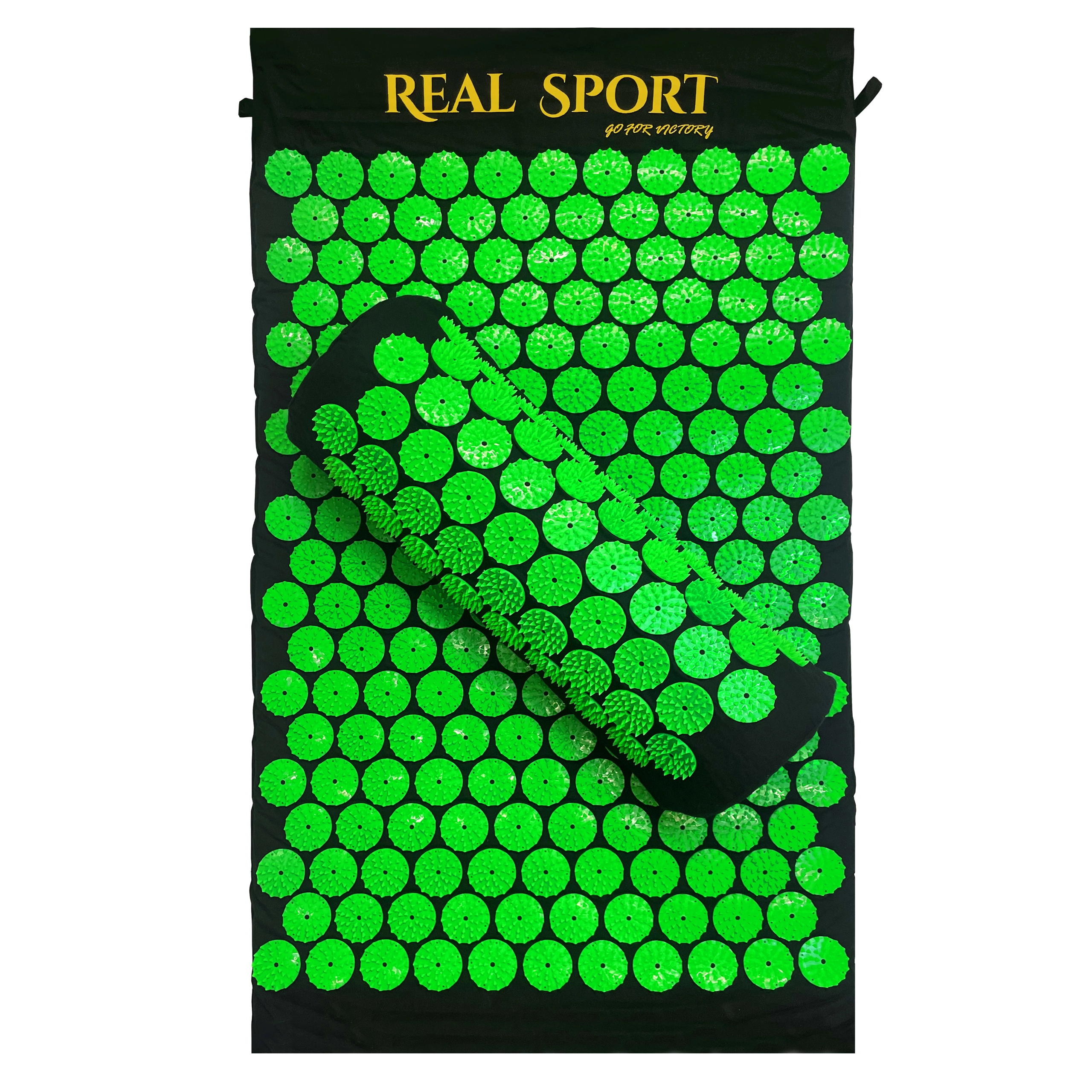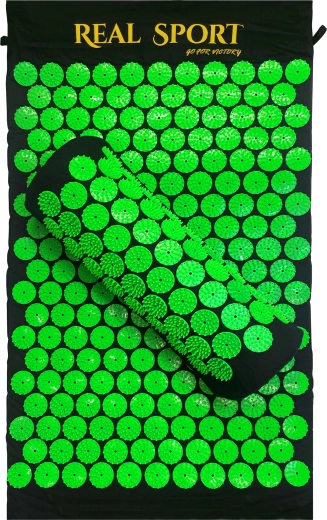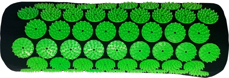 Groene schijven met puntnoppen activeren drukpunten over de volledige lengte van de rug en in de nek, wat helpt bij spierontspanning en een betere doorbloeding.