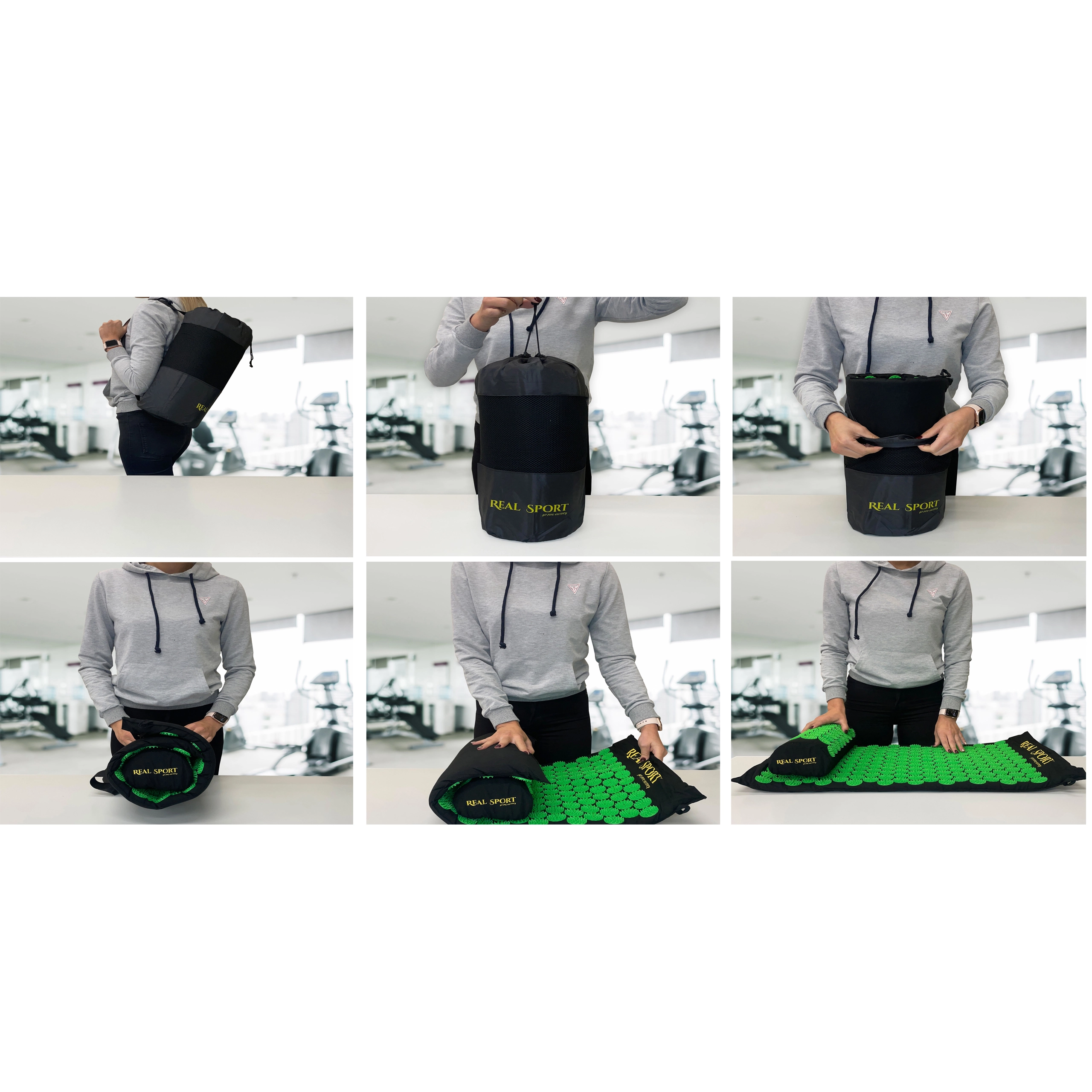 Het rolkussen vult de mat aan en richt zich op gevoelige zones van de nekwervelkolom, schouders en onderrug voor volledige verlichting.