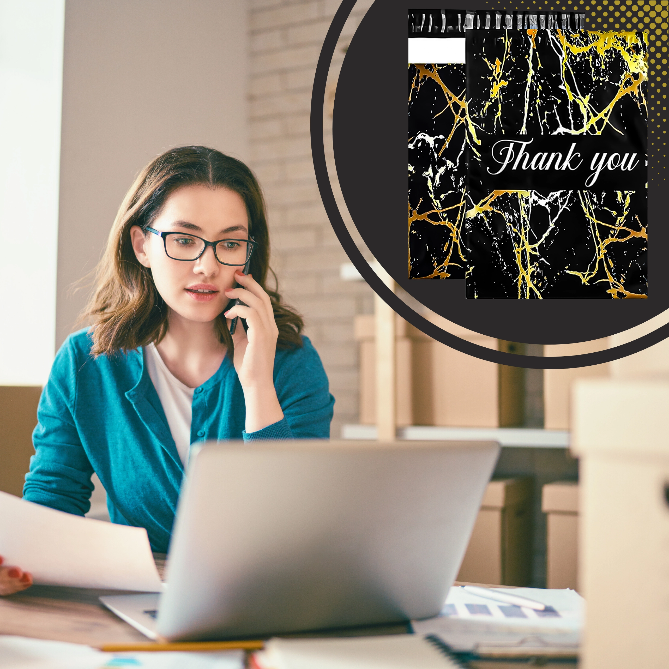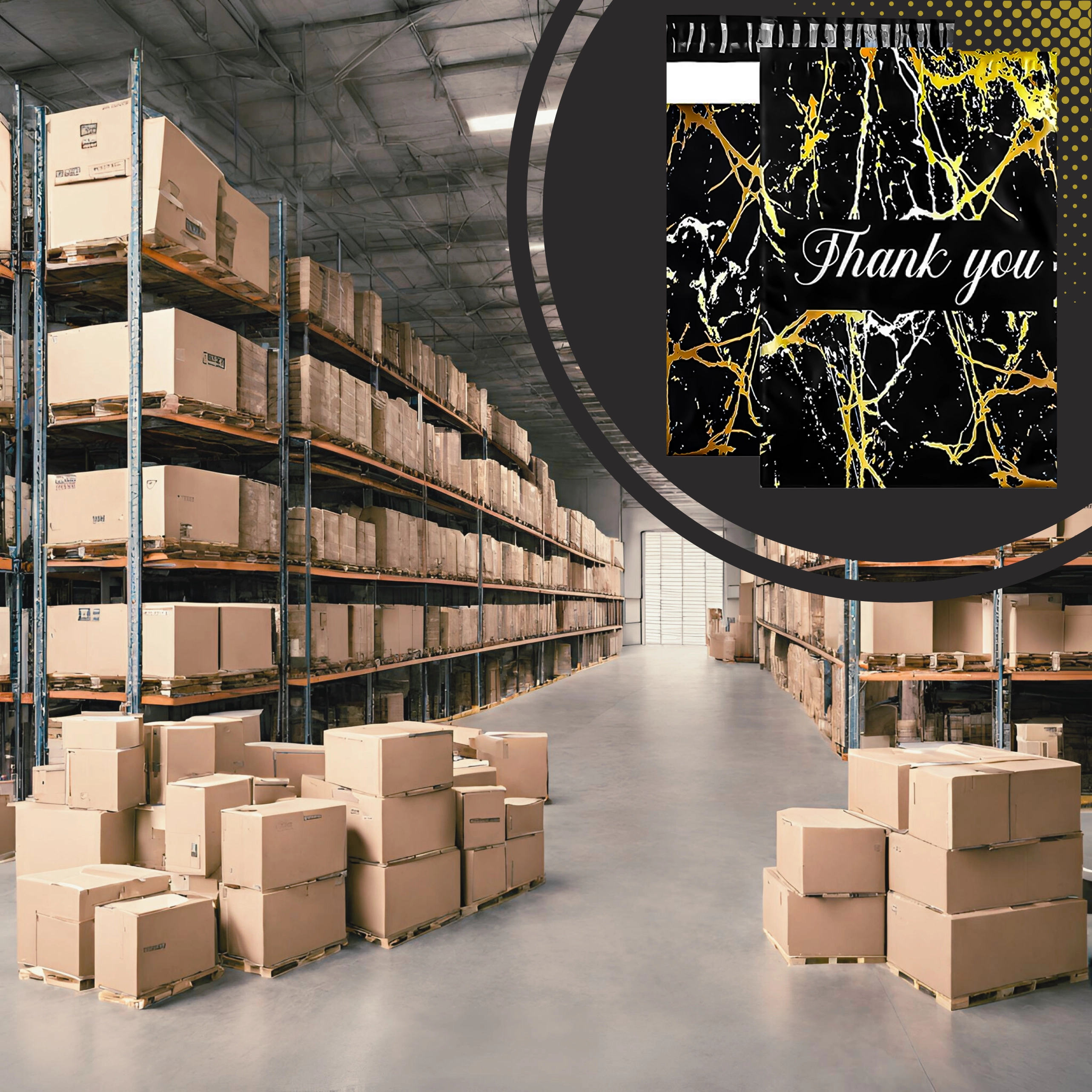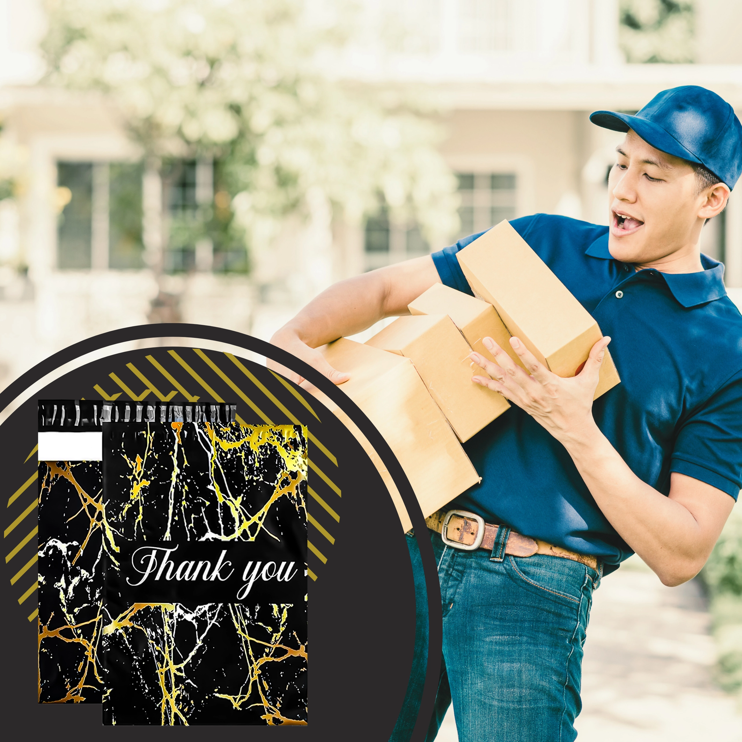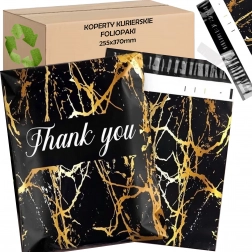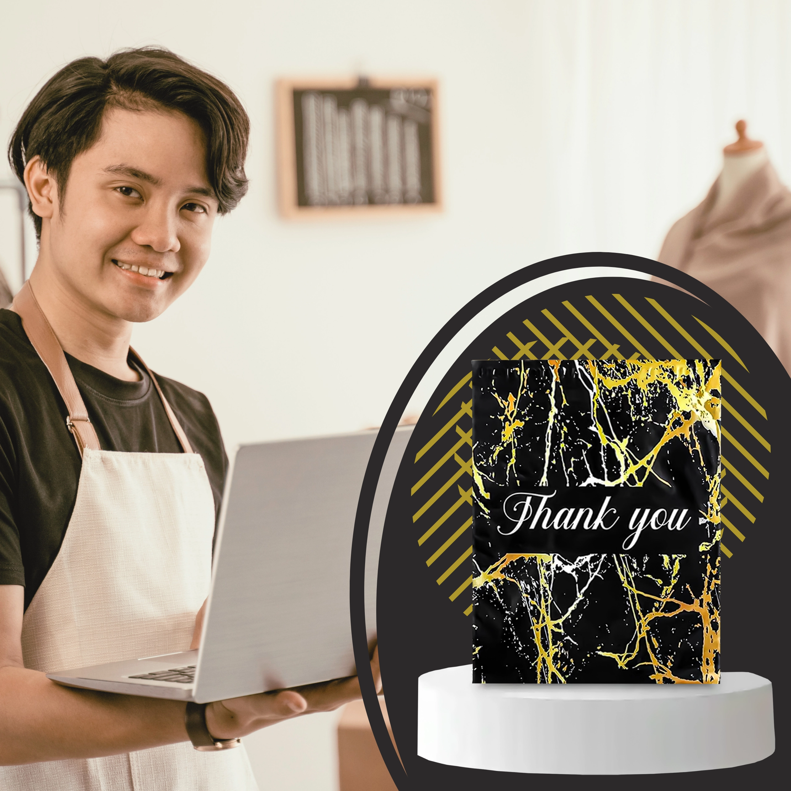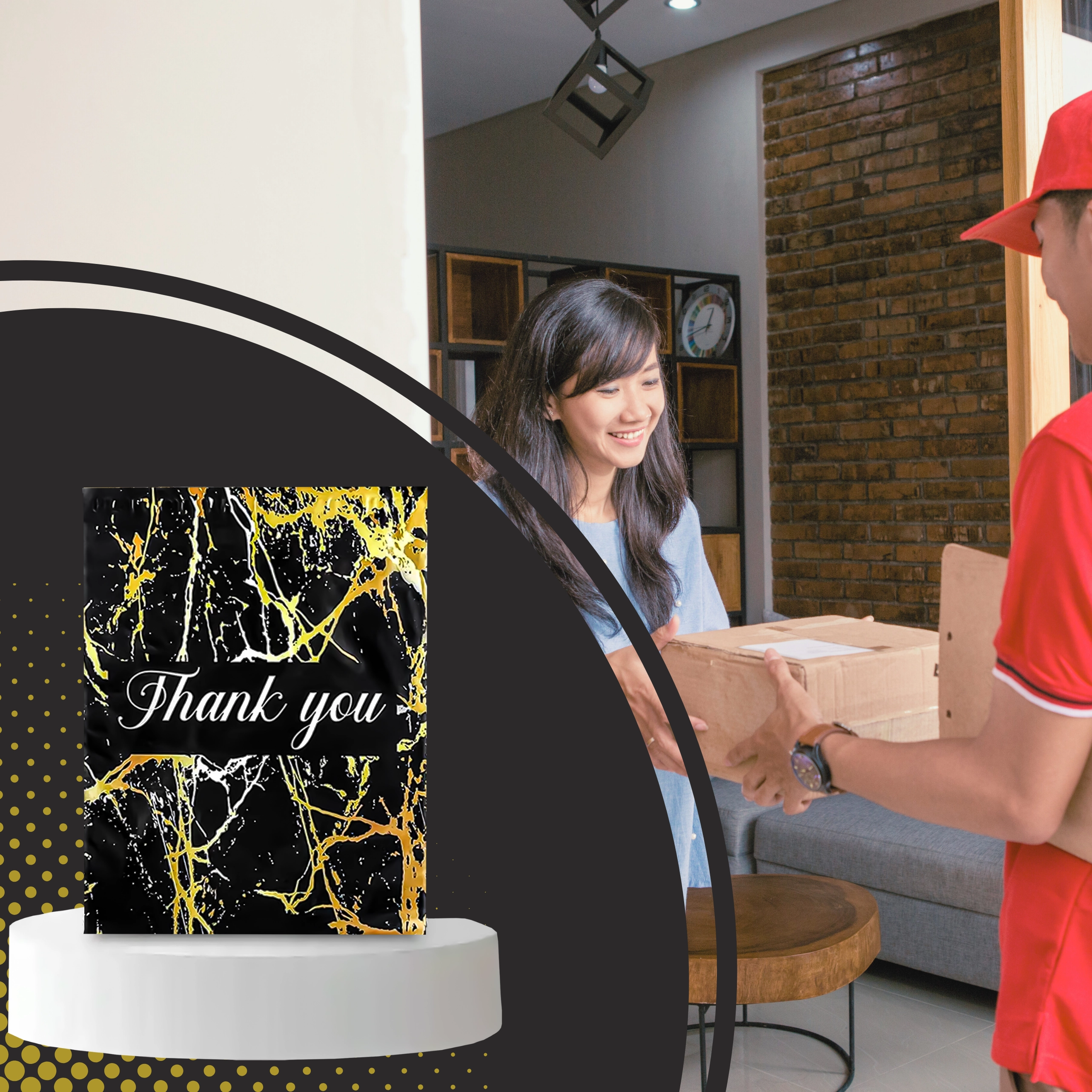 Zoekt u een betrouwbare verpakkingsoplossing voor uw zendingen? Deze koeriers foliopakken combineren duurzaamheid, veiligheid en een professionele uitstraling. Het matzwarte oppervlak met goud marmer en de bedrukking Thank You oogt representatief en versterkt de shopervaring.