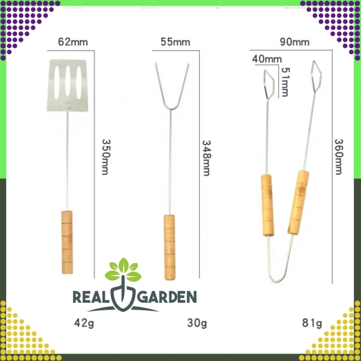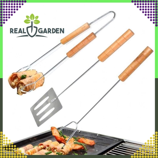 Praktische 3-in-1 barbecueset die elke grillsessie plezierig maakt. Bevat een tang, spatel en vork van roestvrij staal met comfortabele houten handgrepen voor een stevige grip en veilige bediening bij het bereiden van vlees en groenten.