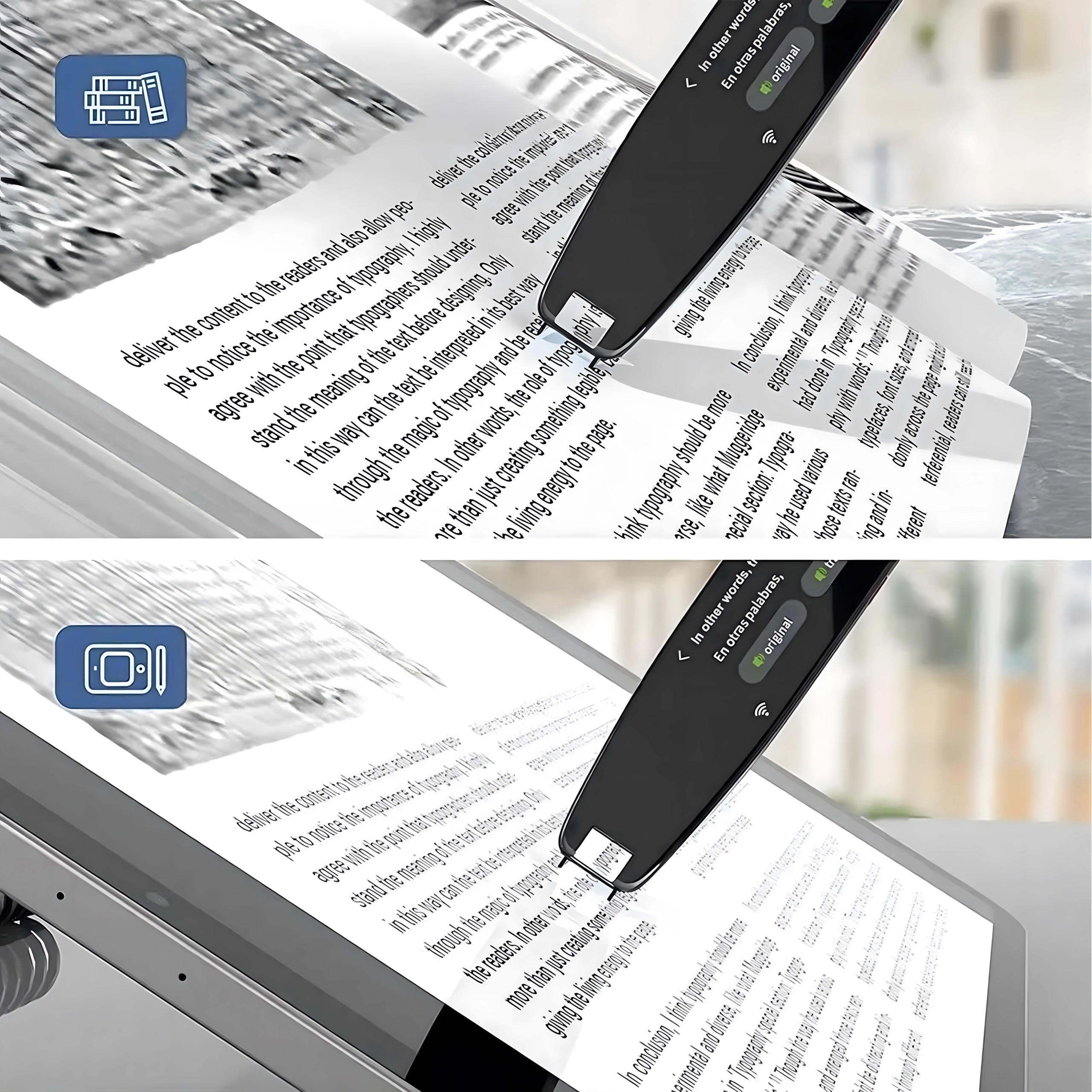 Ga met de pen over de tekstregel en bekijk de vertaling en uitspraak op het scherm. Ideaal voor boeken, scripts en zakelijke documenten.