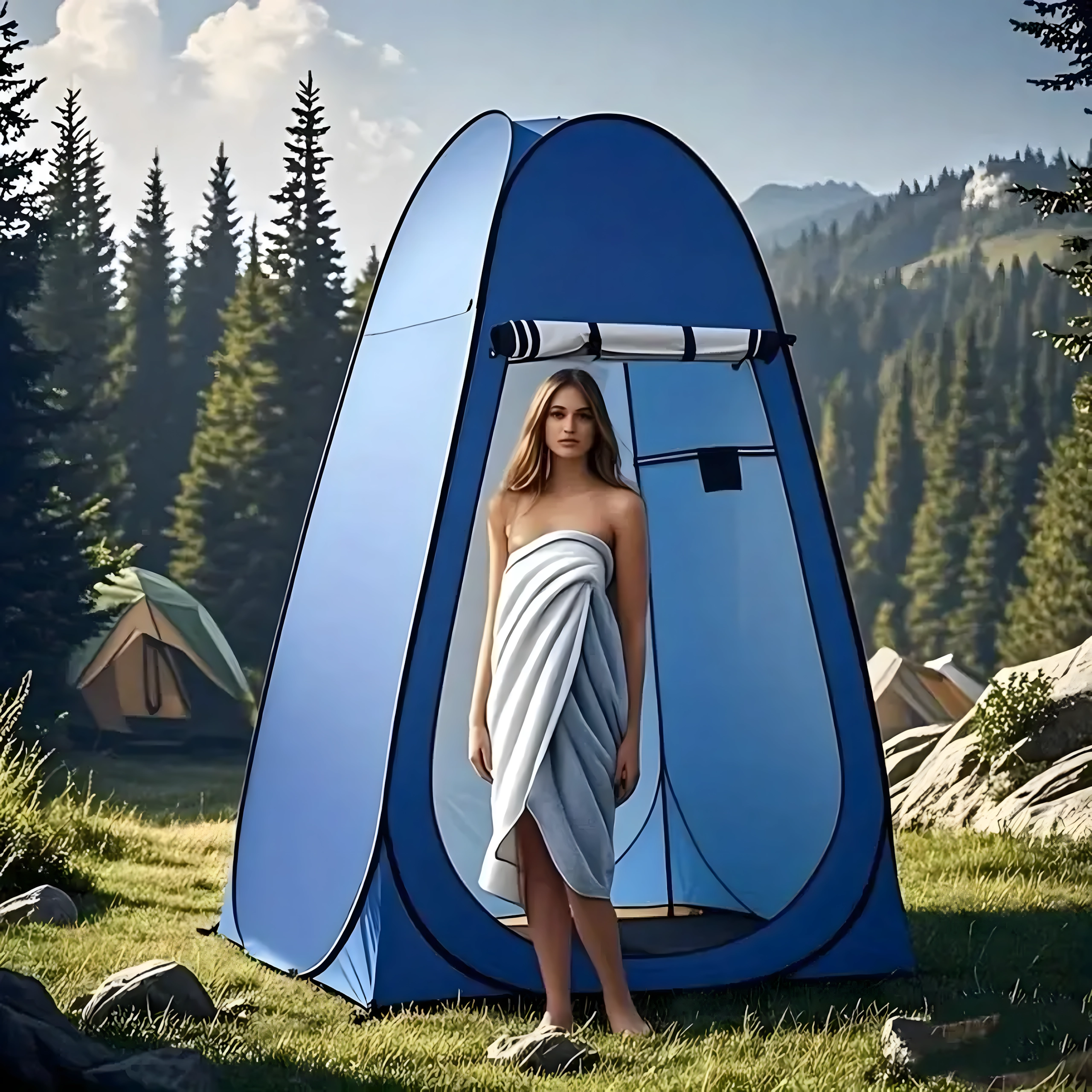 De hoge, afsluitbare cabine biedt een discrete plek om je om te kleden, te douchen of een draagbaar toilet te gebruiken, zelfs op drukke locaties.