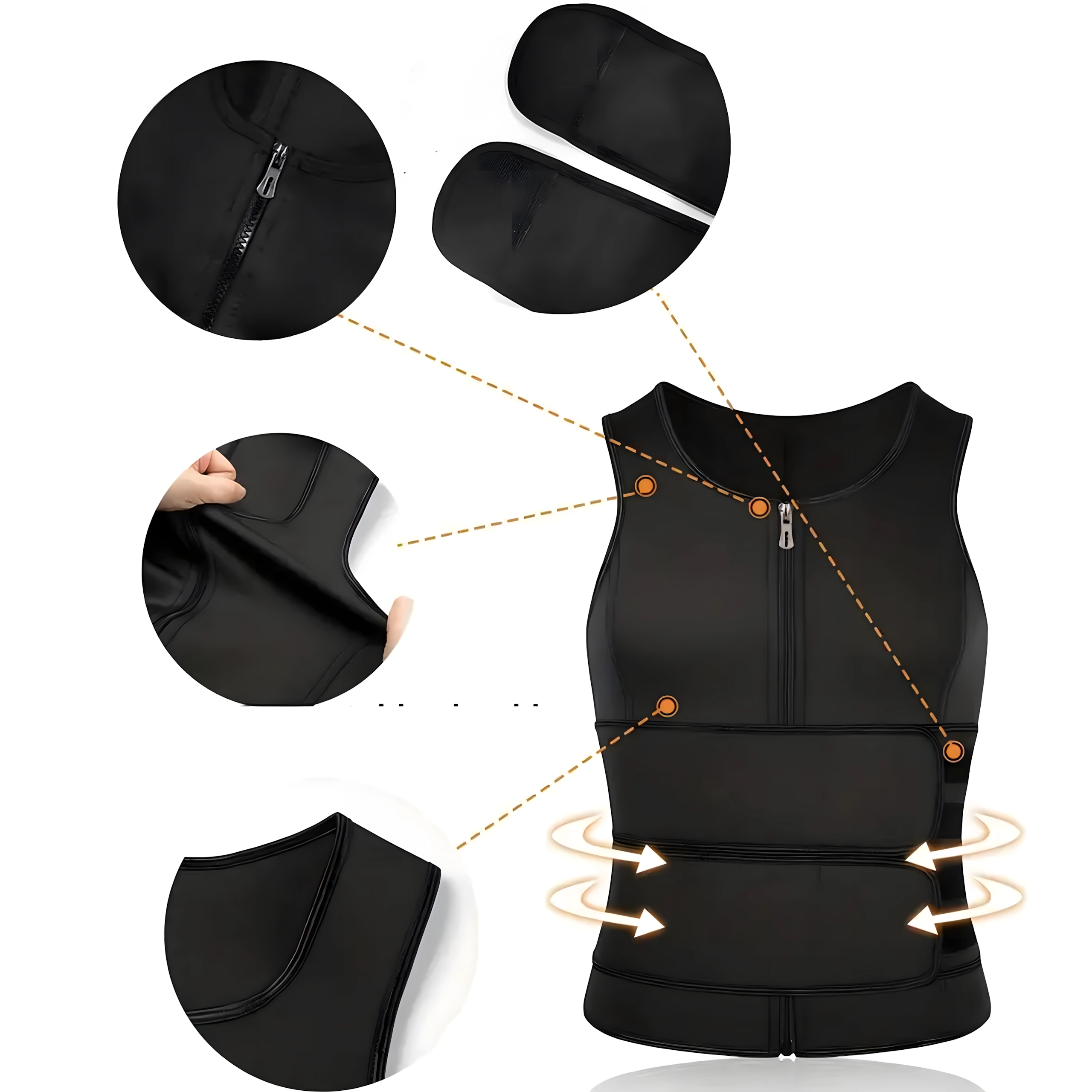 Dit heren compressie sauna-vest combineert een elastisch materiaal met een praktische voorrits en dubbele klittenband-strap. Door het verhoogde thermische effect bevordert het intensiever zweten en kan het lichaamsvormende effecten ondersteunen, terwijl de stevige constructie zorgt voor stabilisatie van core en rug.
