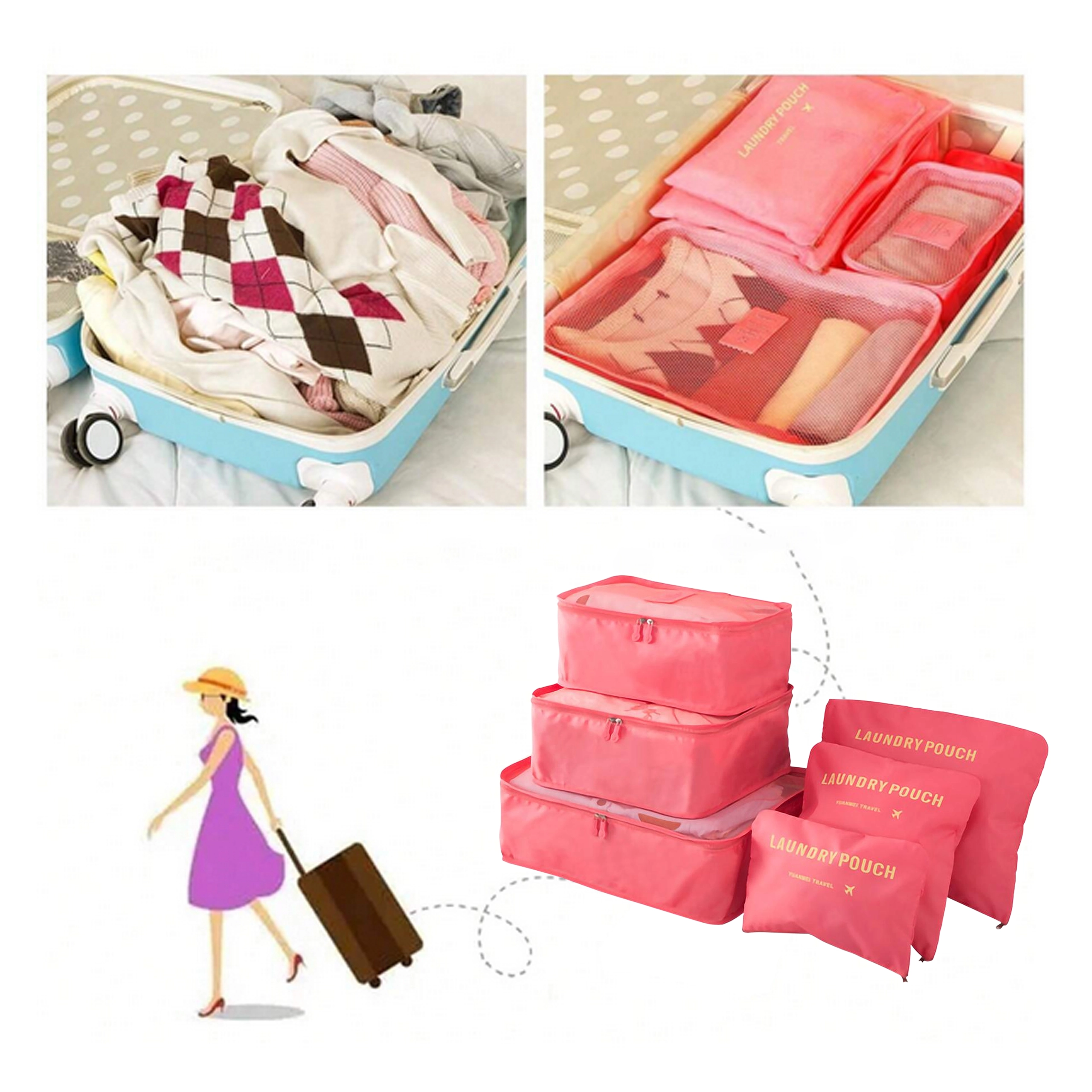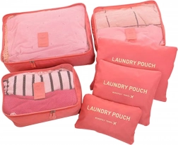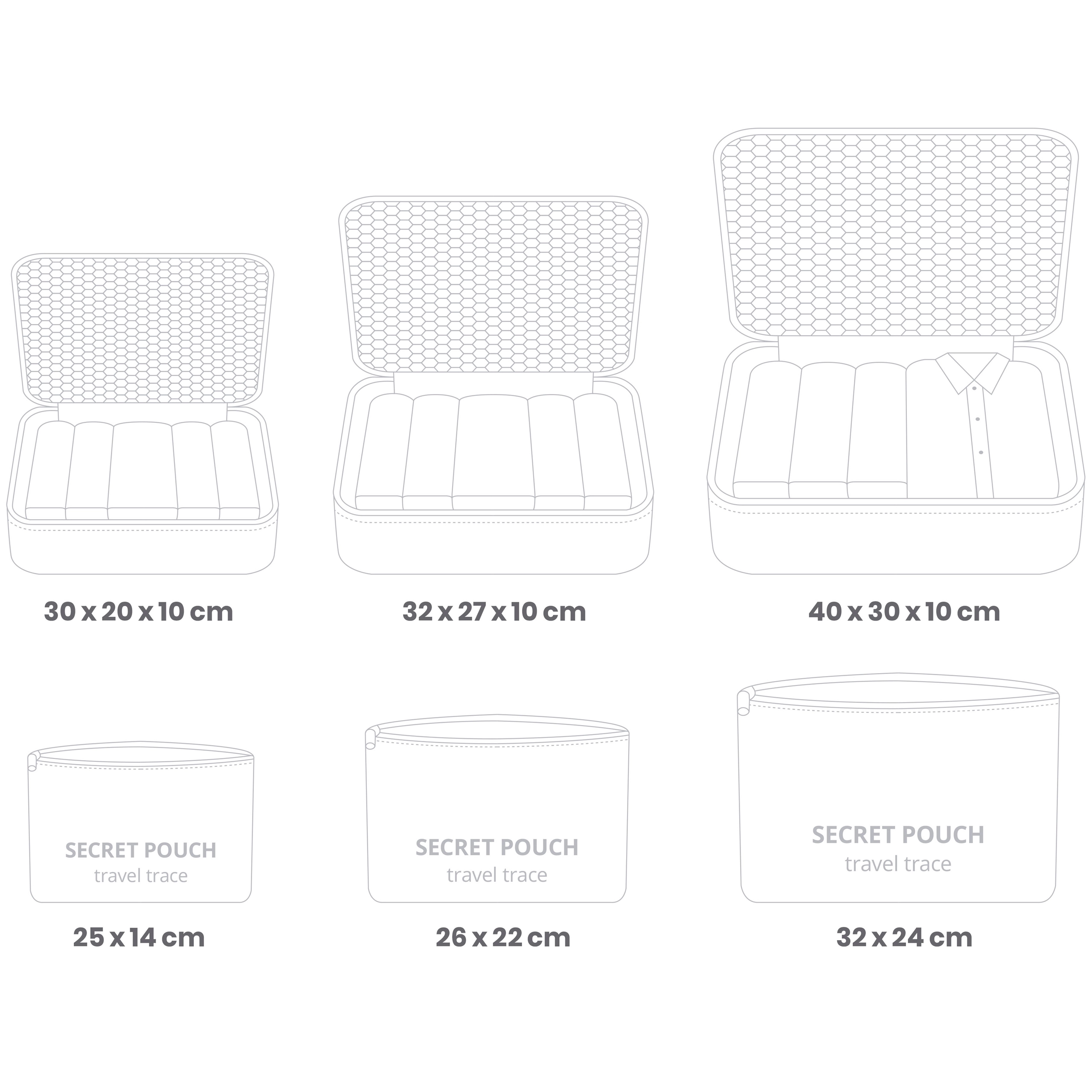 De set bevat drie ruime kubussen met ademende mesh en drie platte zakjes met het opschrift “Laundry Pouch” voor vuile was. Licht textielmateriaal en stevige ritsen zorgen voor comfortabel inpakken, overzicht en bescherming van je spullen tijdens het reizen.