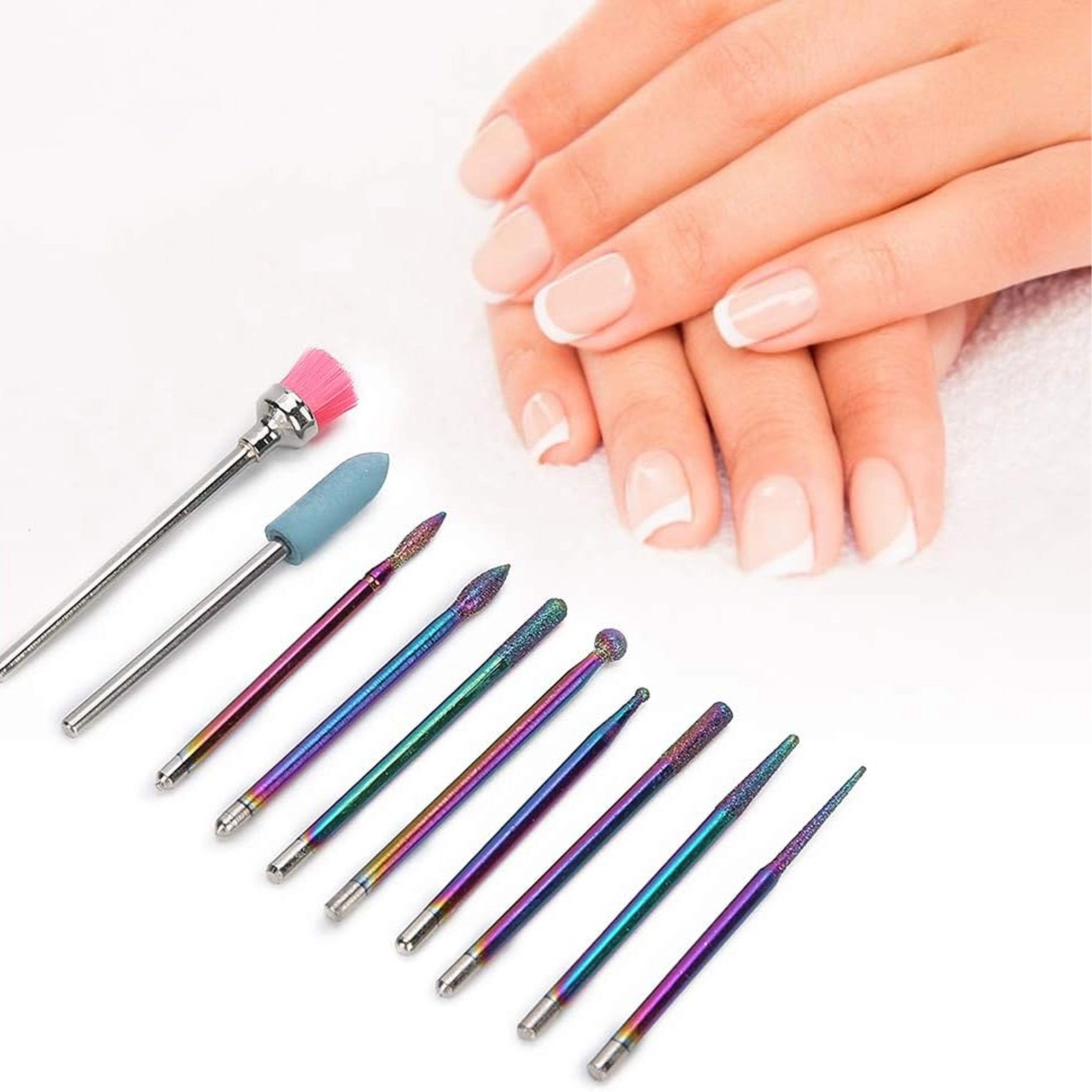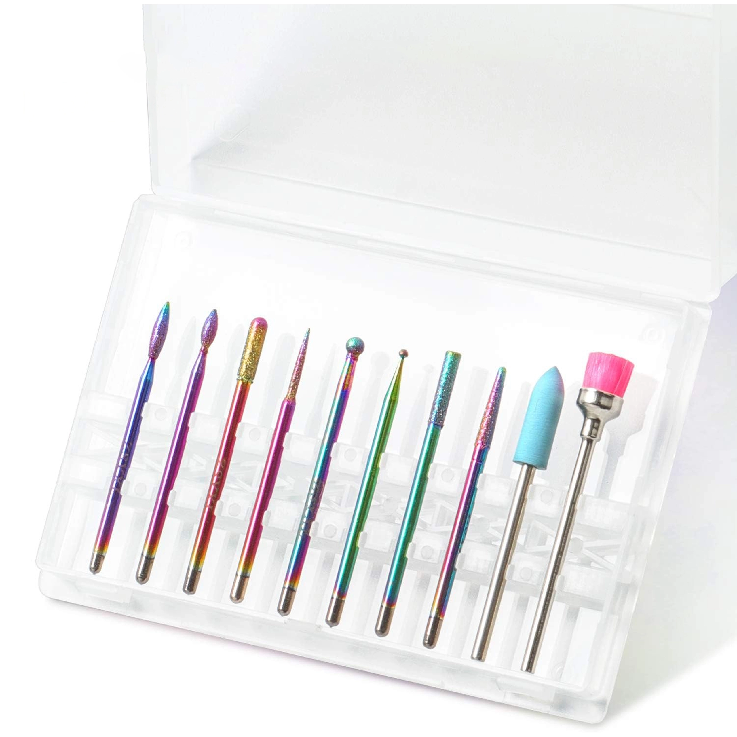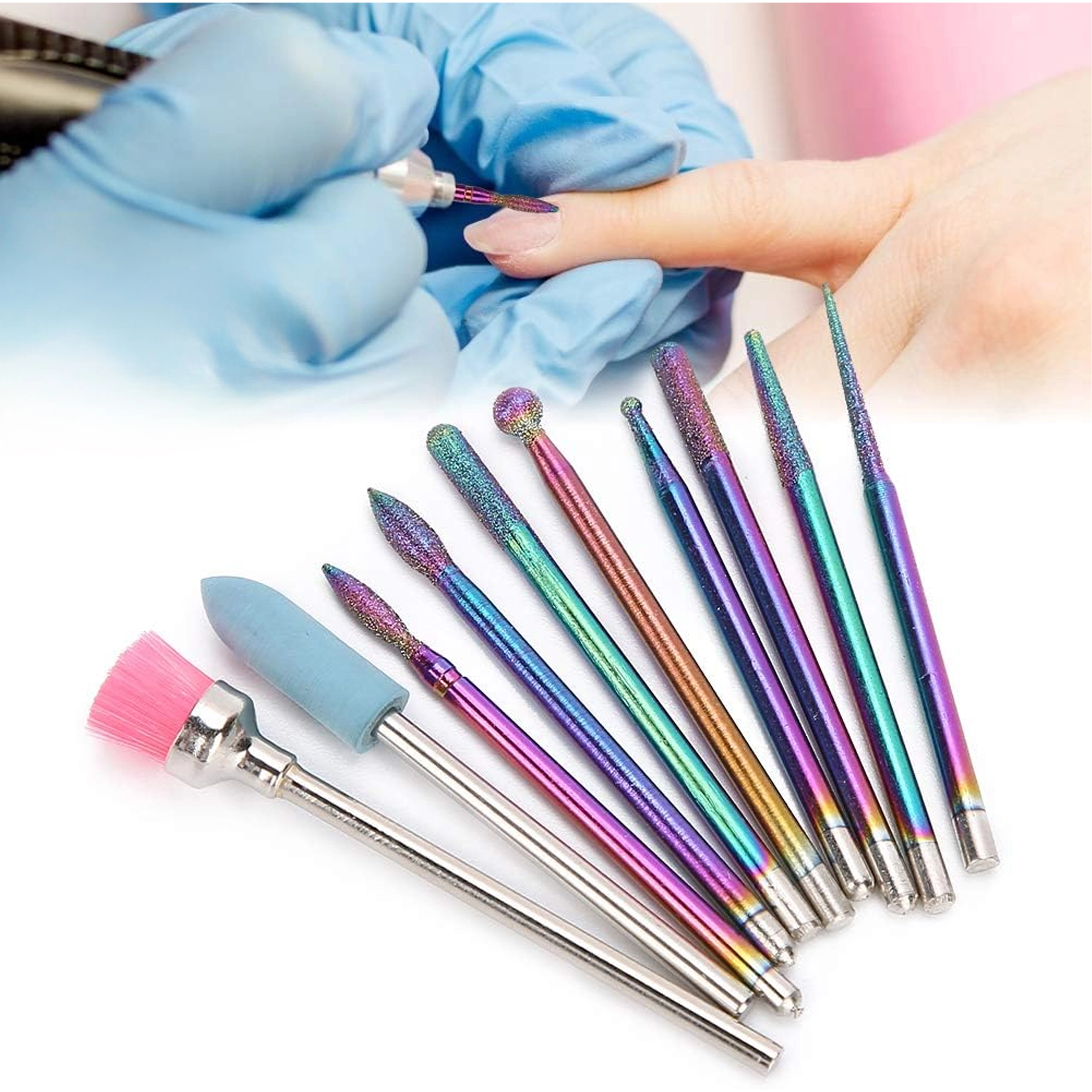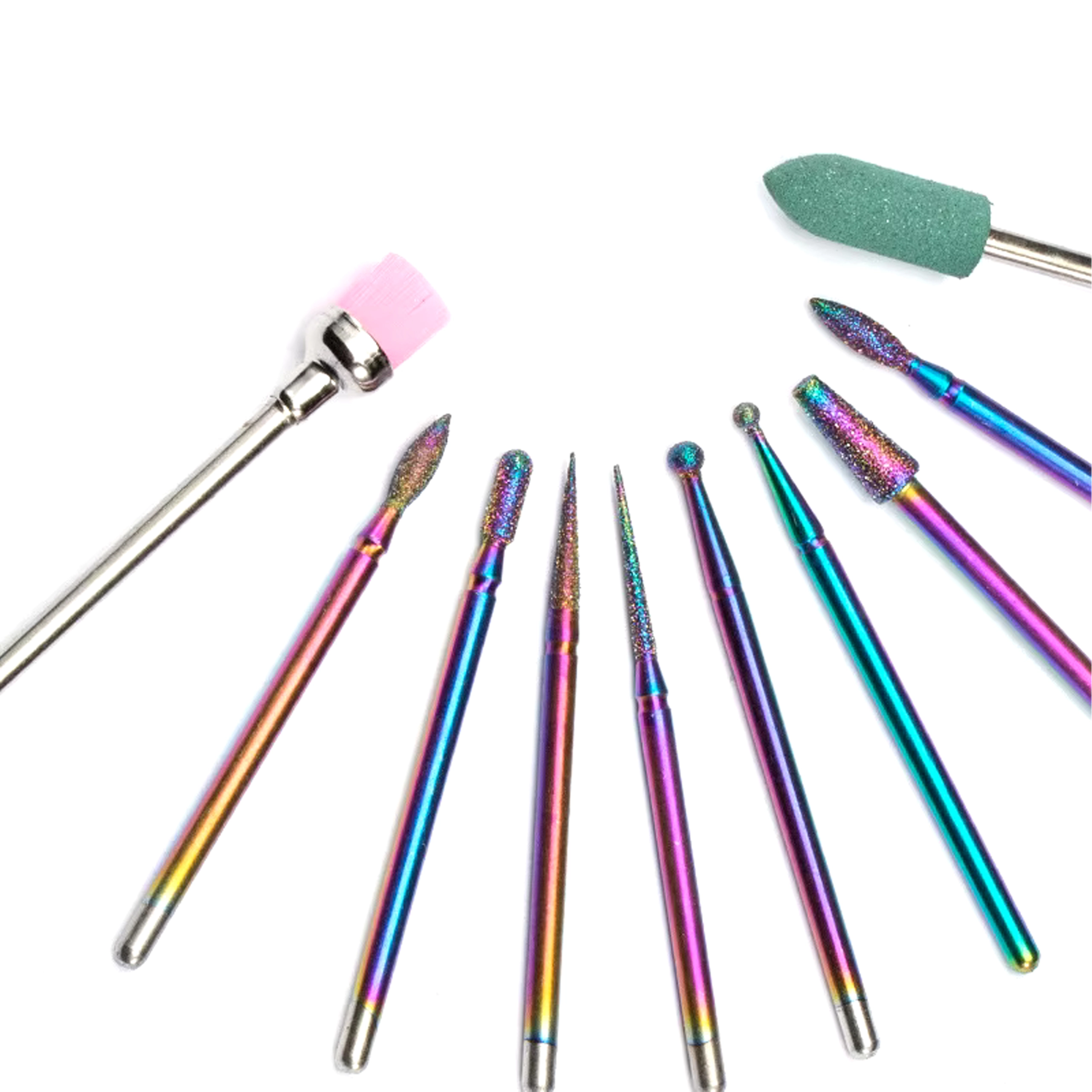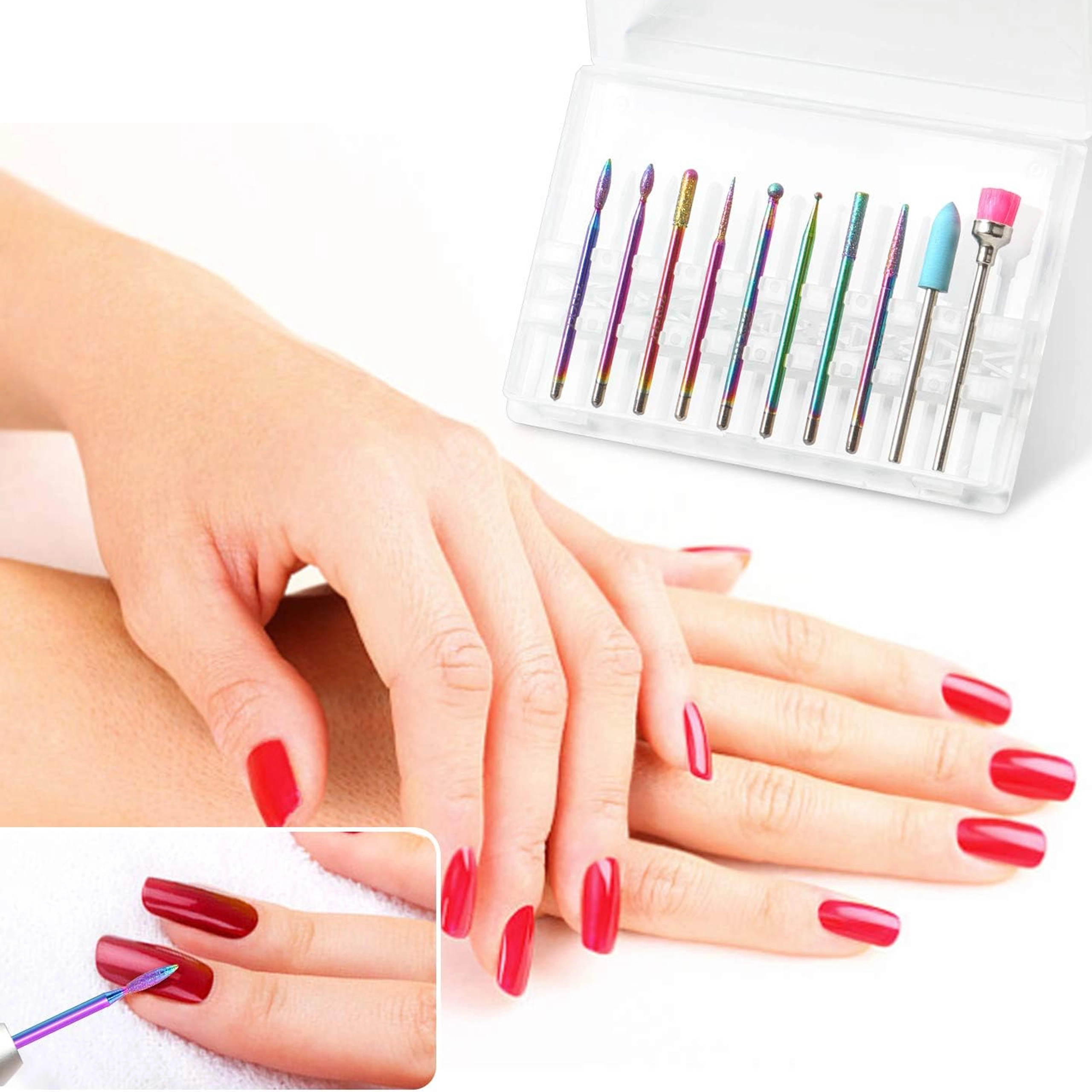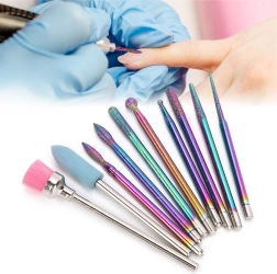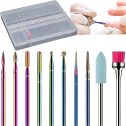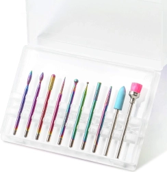 Deze universele set van 10 frezen is ontworpen voor precies en comfortabel werken bij manicure en pedicure. Combineert diamanten en keramische opzetstukken voor het voorzichtig verwijderen van verharde nagelriem, vijlen en vormen, reinigen rondom de nagel en het reduceren van verharde lagen gel of acryl.