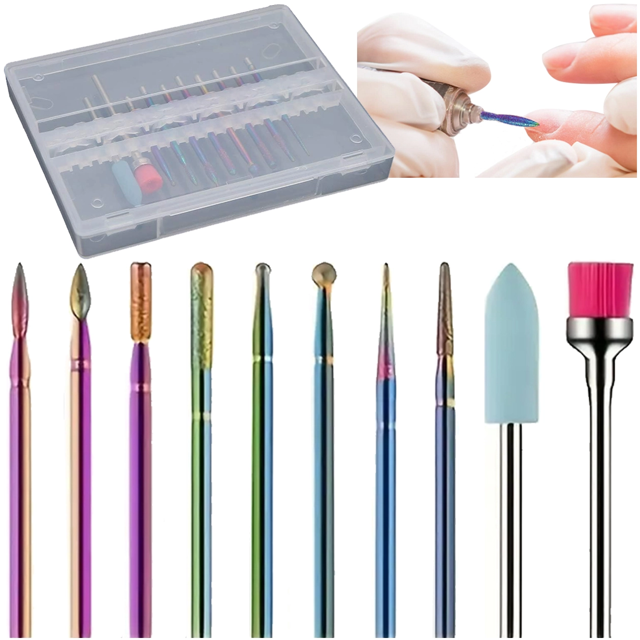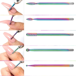 Dankzij de verschillende vormen (kegel, cilinder, bol, naald enz.) bereik je een gedetailleerde bewerking van het nageloppervlak, het verwijderen van oud materiaal en een precieze nabehandeling zonder onnodige warmte. De set is ideaal voor salons en thuisgebruik en compatibel met gangbare elektrische nagelfrezen.