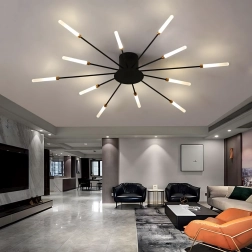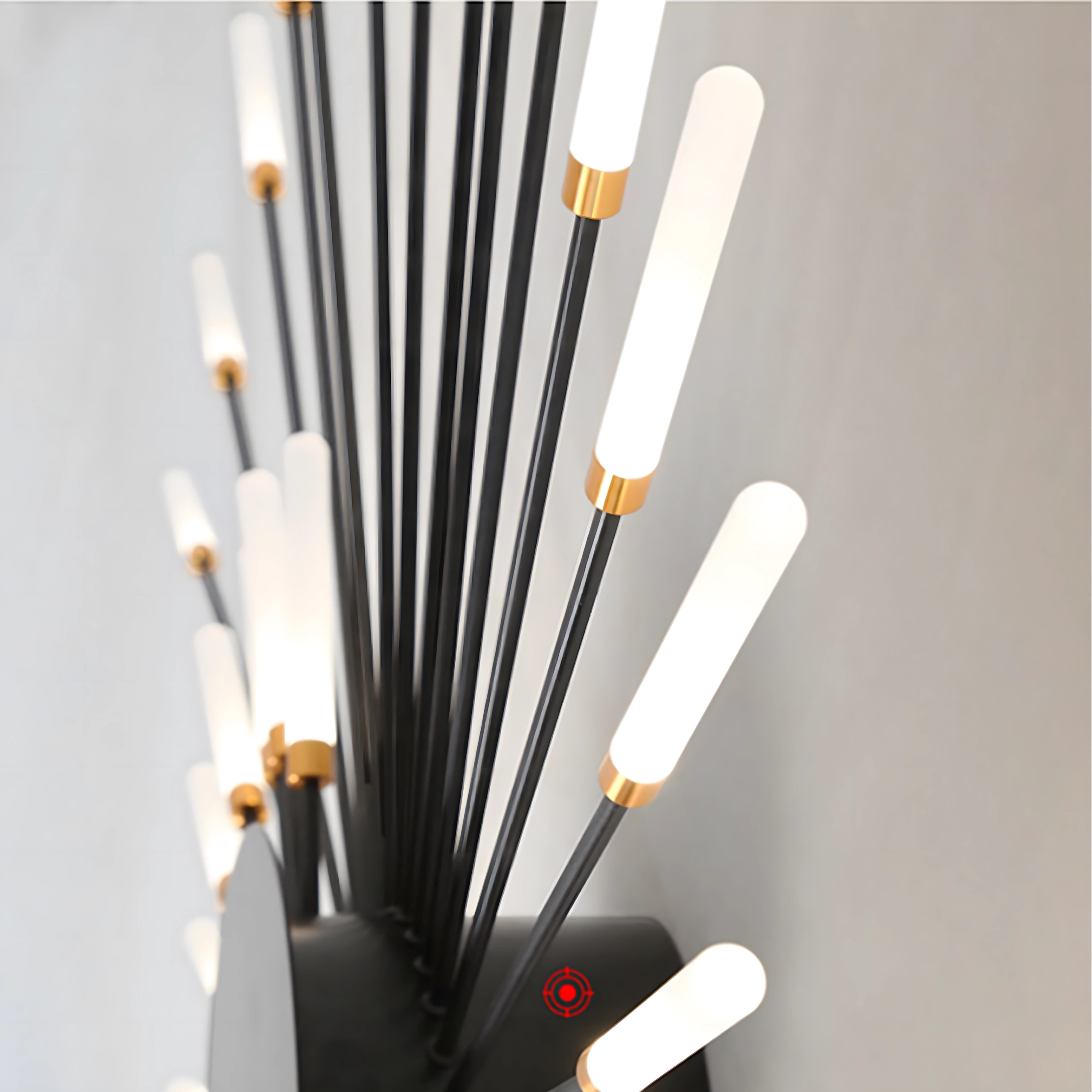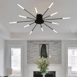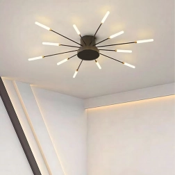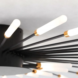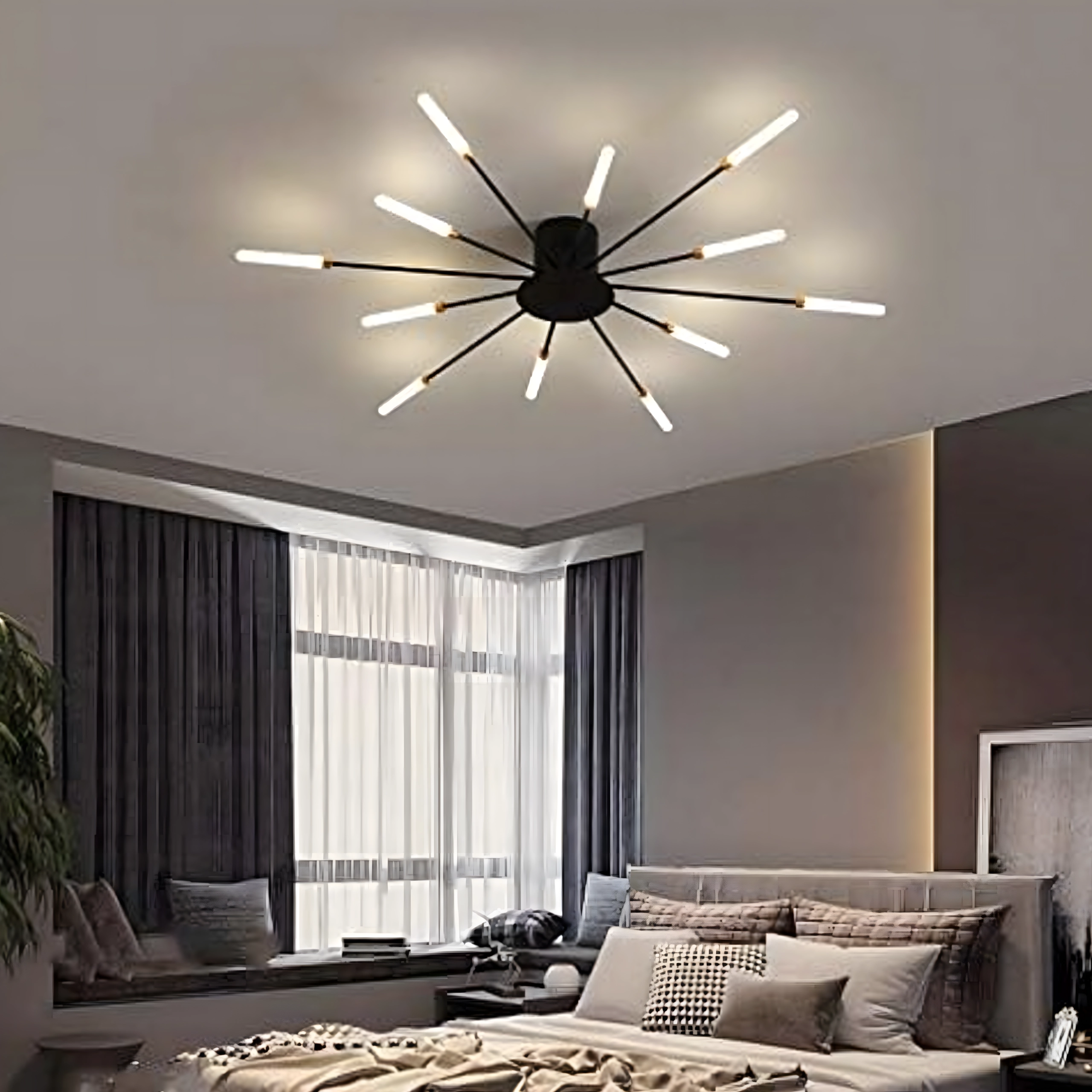 De stijlvolle plafondlamp met meerarmige constructie creëert een vuurwerkeffect en geeft je interieur een uitgesproken karakter. Energiezuinige LED’s zorgen voor een gelijkmatige omgevingsverlichting zonder verblinding, terwijl matzwart en gouden details de moderne esthetiek benadrukken.
