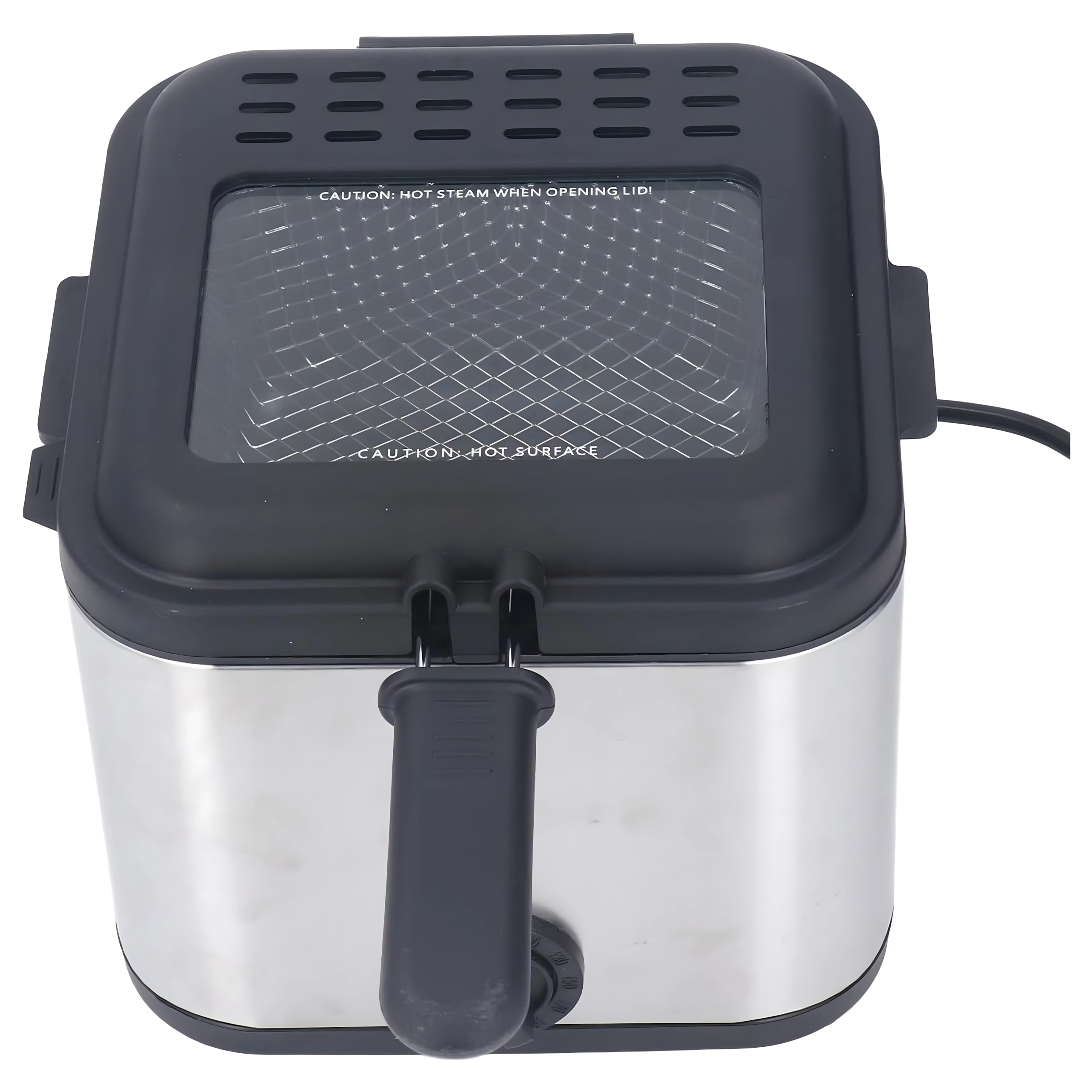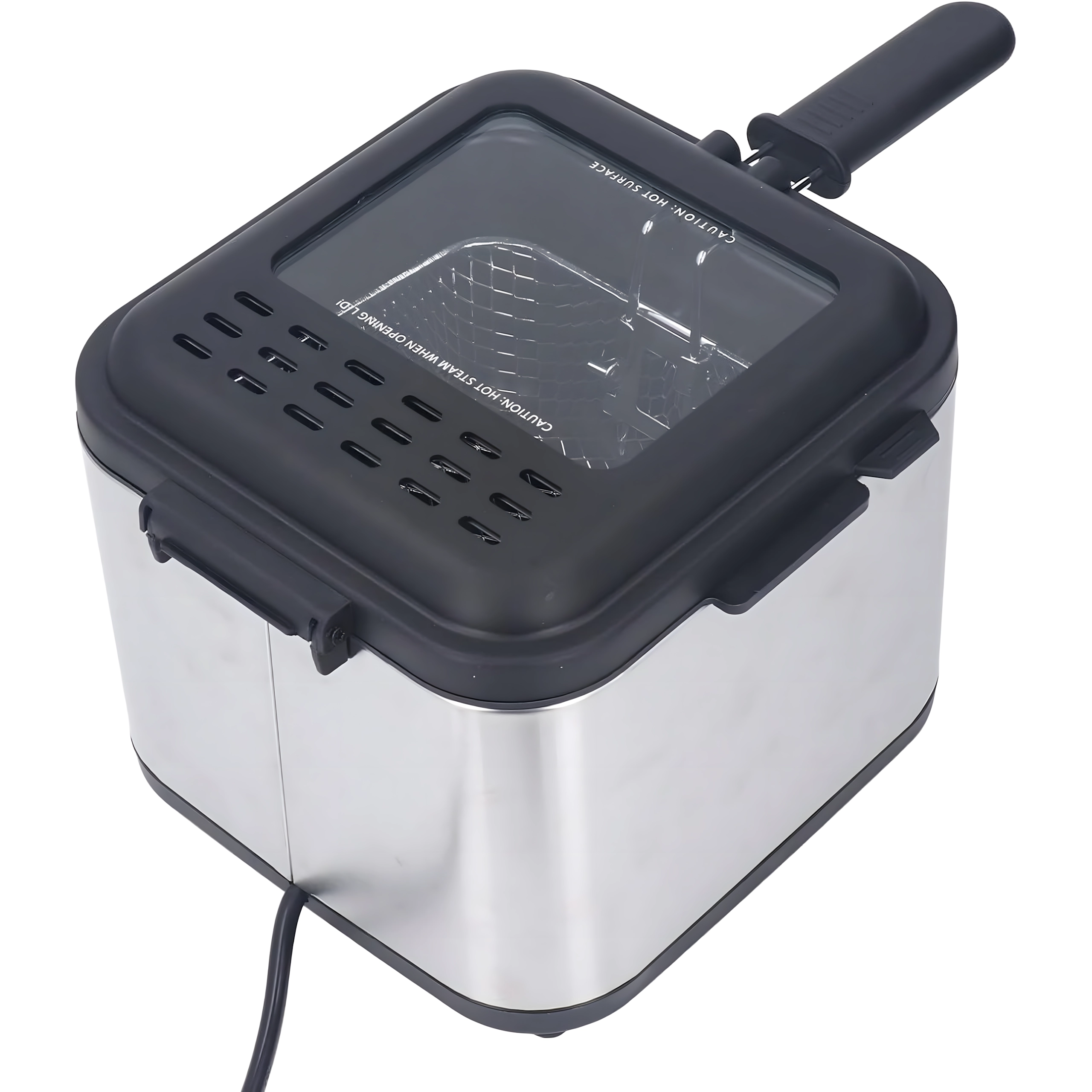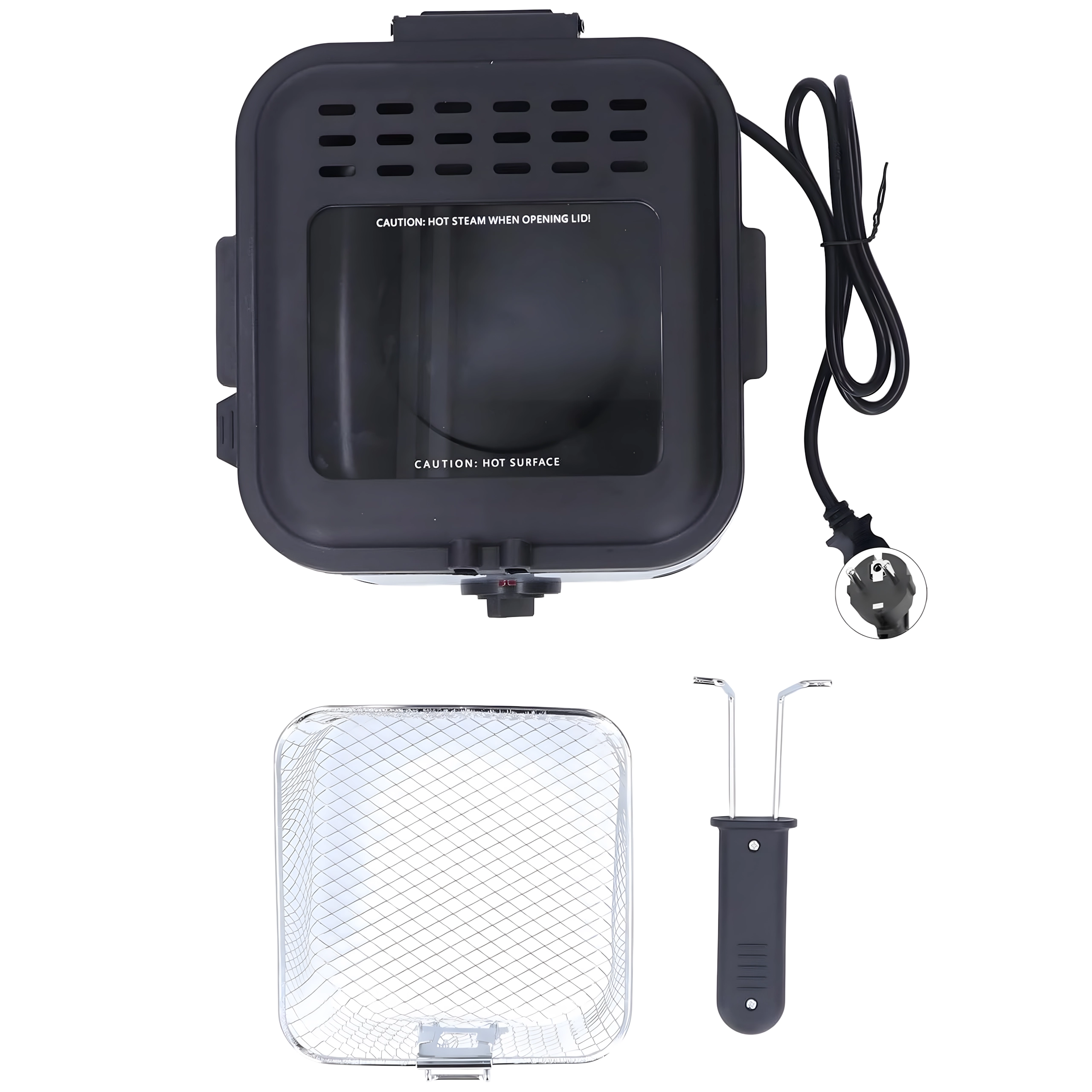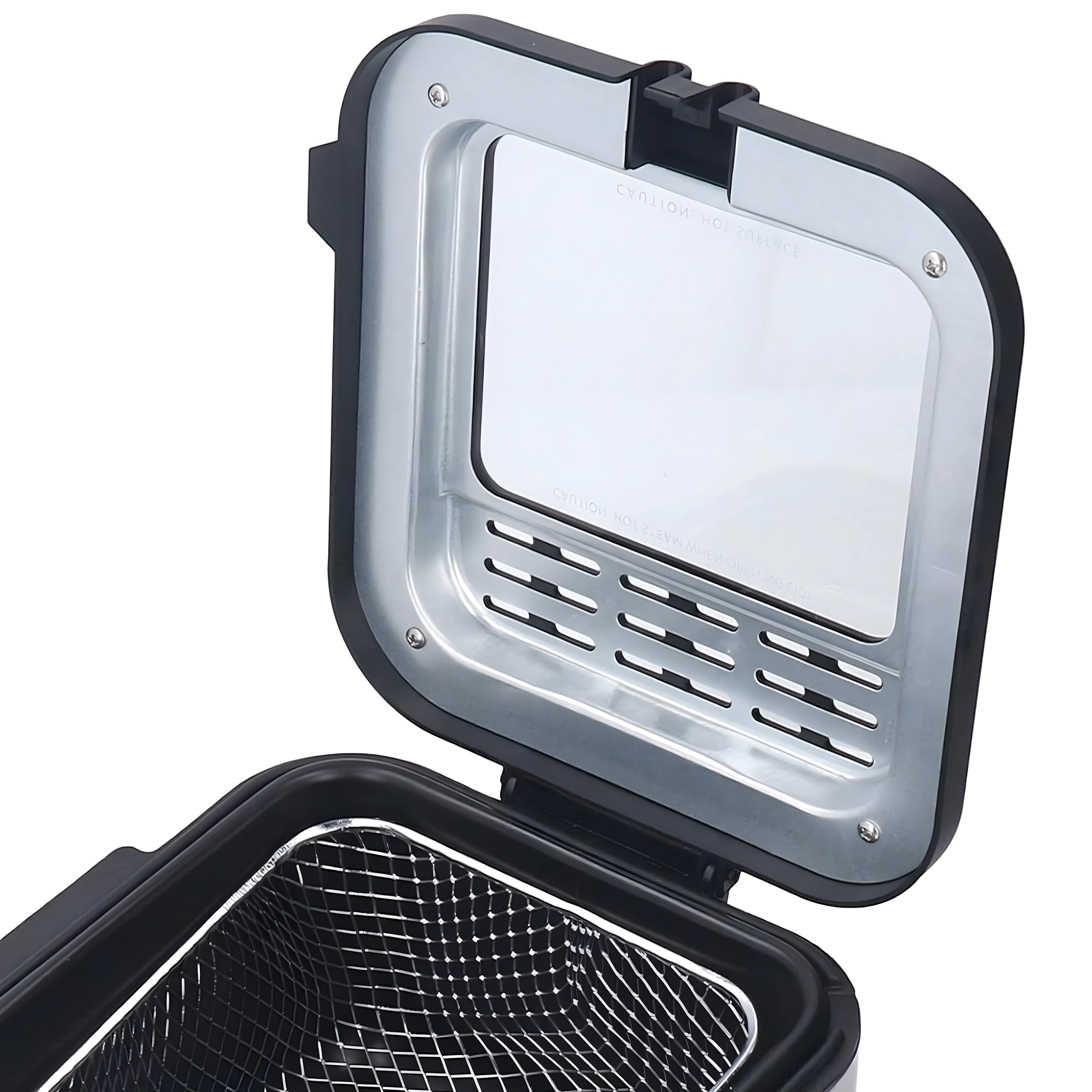Het praktische kijkvenster in het deksel laat u het proces volgen zonder onnodig te openen, wat helpt de olietemperatuur stabiel te houden. Het vermogen van 1000 W zorgt voor efficiënte opwarming en gelijkmatige resultaten. De uitneembare mand met handgreep vergemakkelijkt de bediening en veilig afgieten van olie.