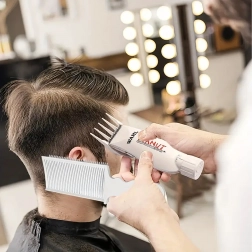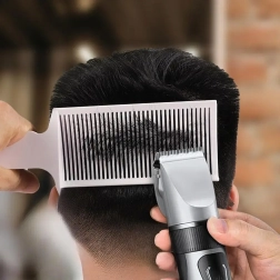 De fijne en medium tanden van de kam geleiden het haar betrouwbaar bij werken met tondeuse en schaar, zodat je een gelijkmatige coupe en vloeiende overgangen behaalt.
