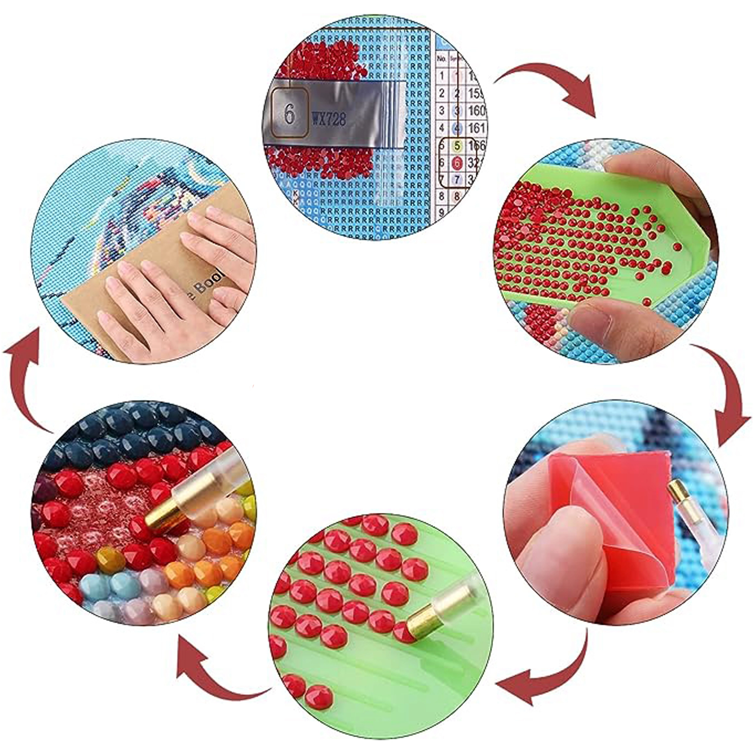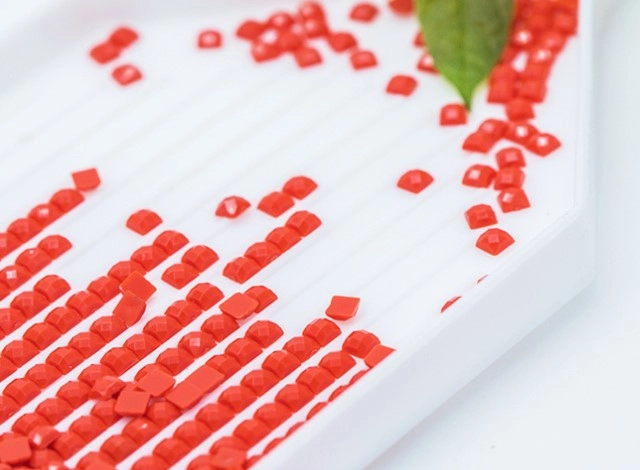 Geribbelde bakjes lijnen de steentjes in rijen voor snel oppakken, de was in de pen houdt de drills vast en de legenda met symbolen leidt elke stap. Een precies resultaat, zelfs voor beginners.