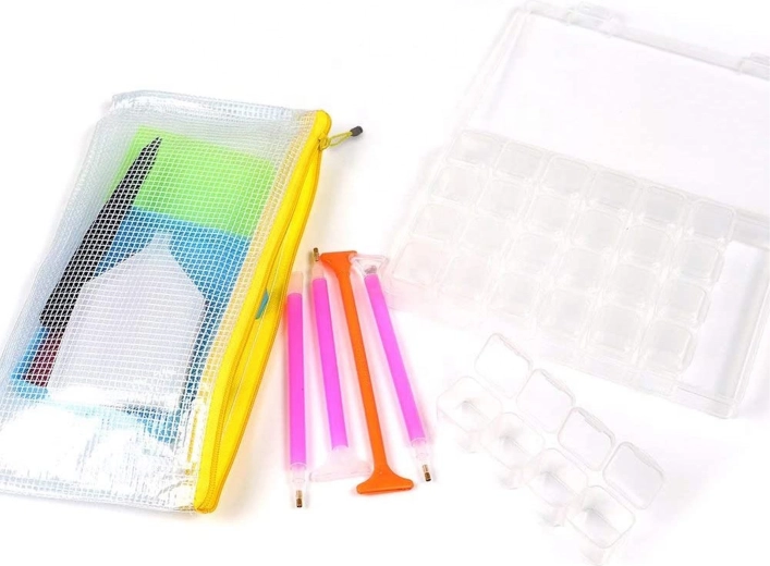 Een complete set voor diamond painting die het maken van schitterende mozaïeken makkelijker maakt. Bevat een roller voor gelijkmatige aandrukking van steentjes, bakjes om te sorteren, applicators, pincet, wax en praktische organizers, zodat je alle kraaltjes overzichtelijk bij de hand hebt.