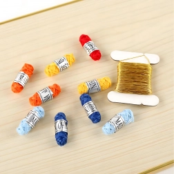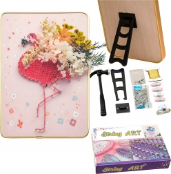 Houten bord met voorbeeld, spijkertjes, garen, kleine accessoires en gereedschap – kortom alles wat je nodig hebt om een indrukwekkend kunstwerk te maken zonder extra materialen te hoeven zoeken.