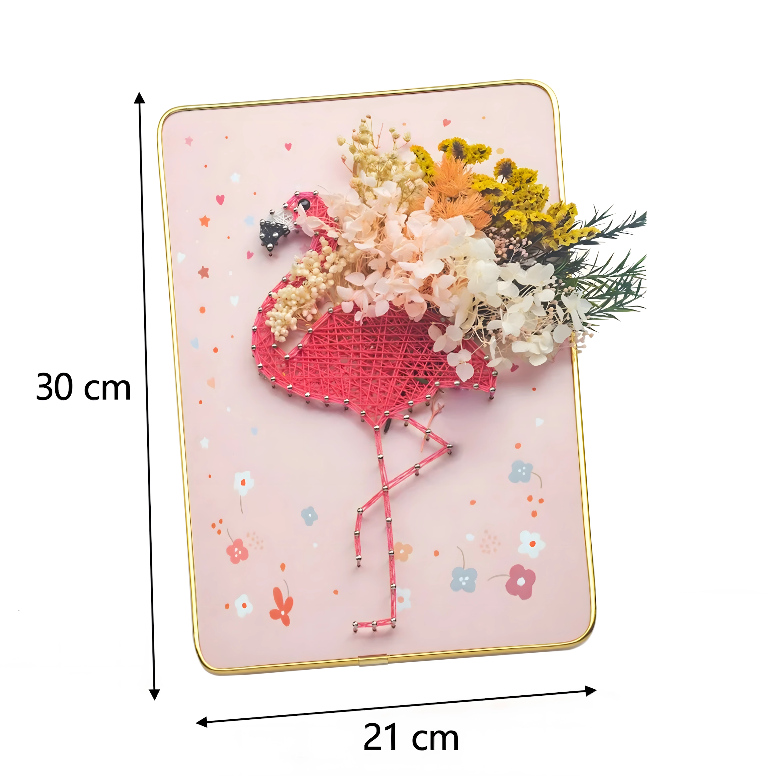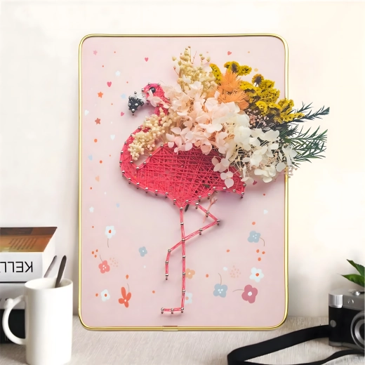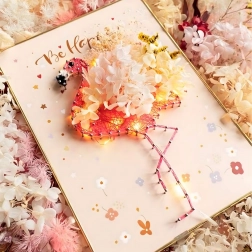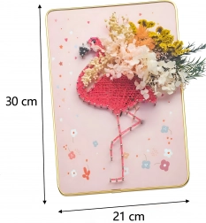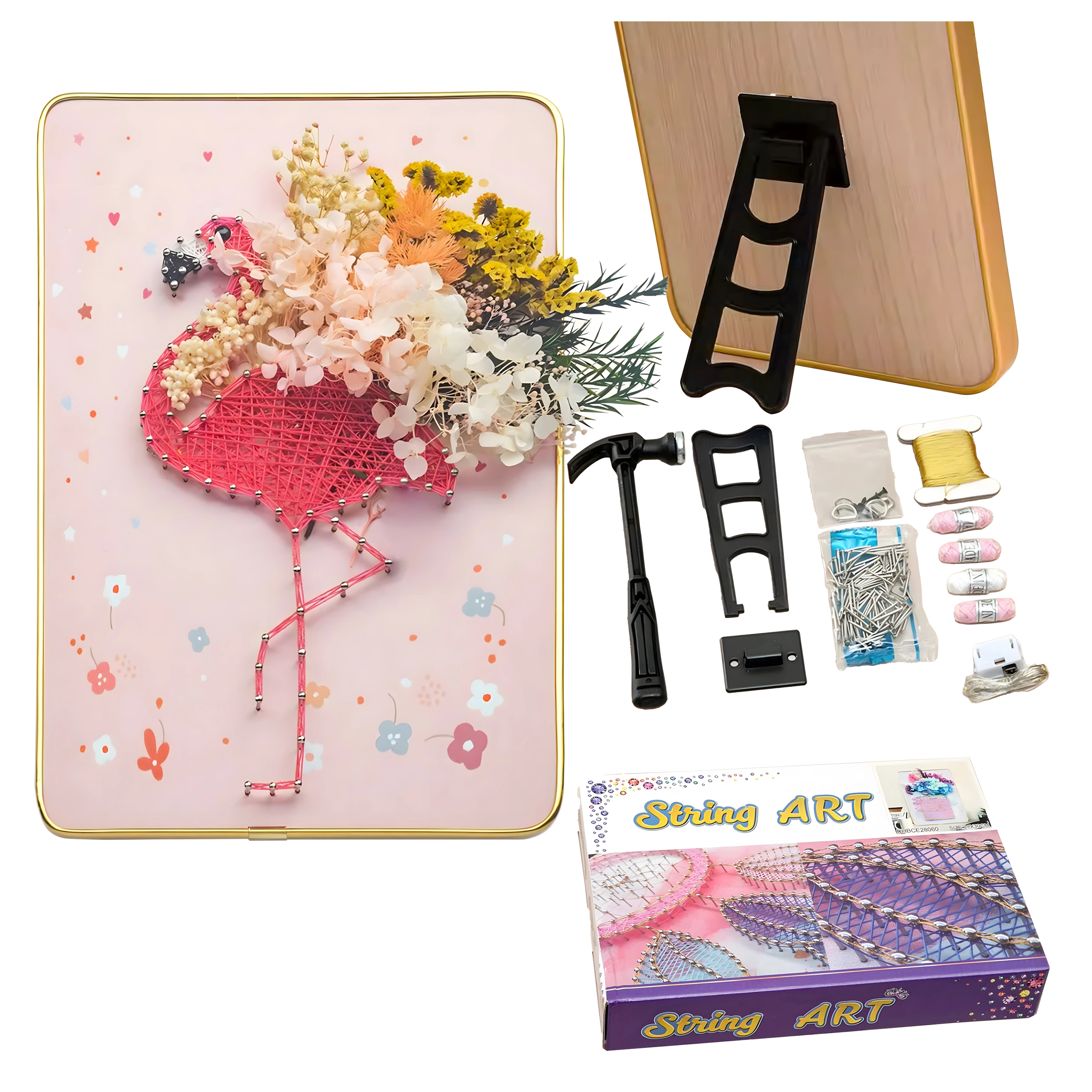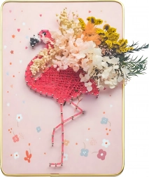 Met deze creatieve string-artset (garen om spijkertjes lussen) maak je eenvoudig een stijlvol kunstwerk met een flamingo- en bloemenmotief. Het afgewerkte kunstwerk kun je ophangen aan de muur of neerzetten op een plank. De geïntegreerde LED-verlichting laat het motief stralen en verandert het in een betoverende lichtdecoratie.